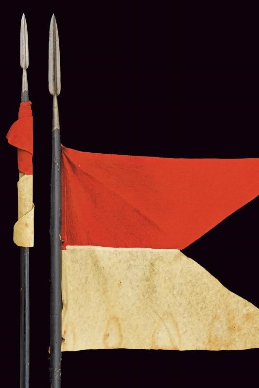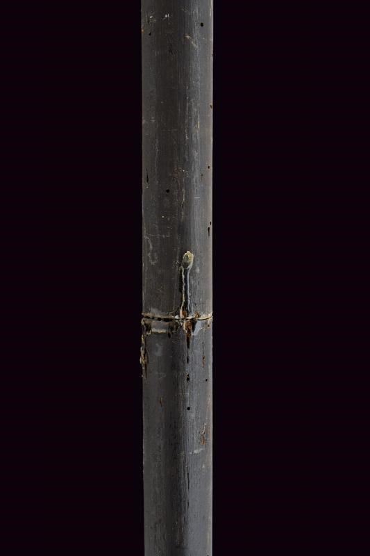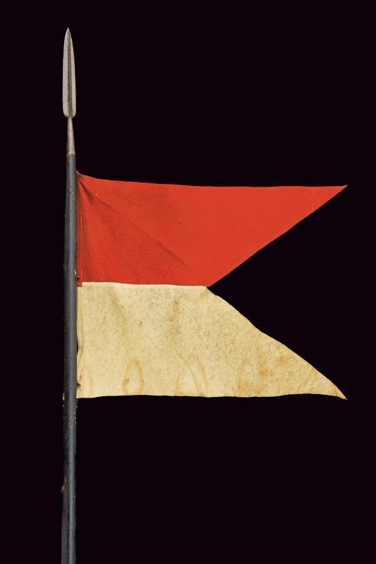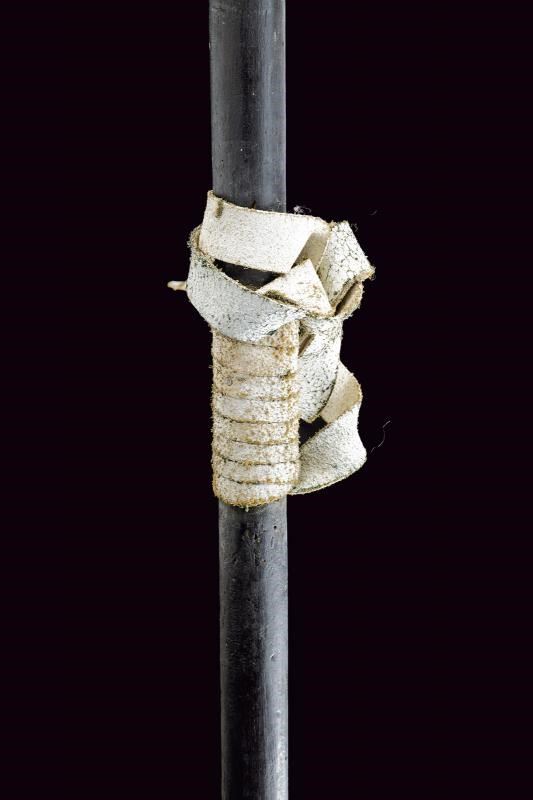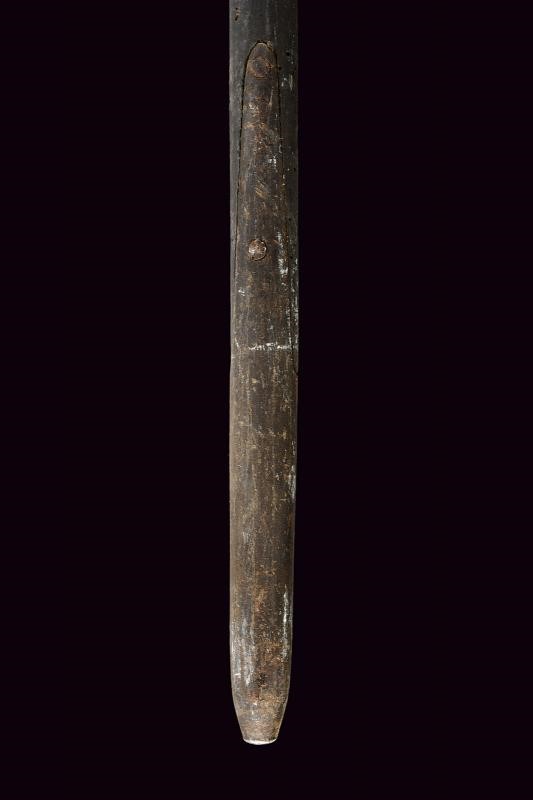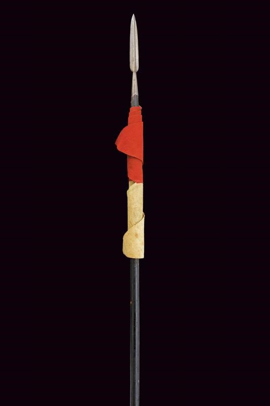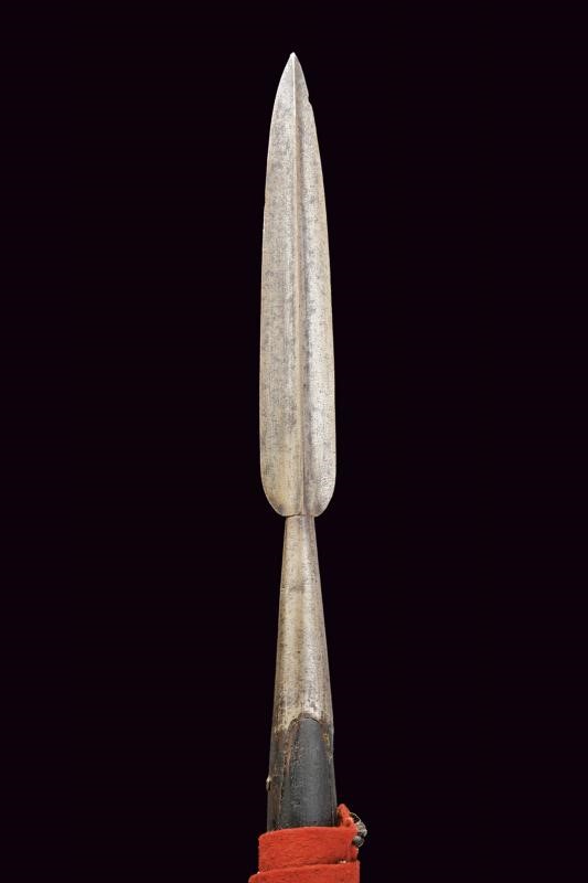 Lama a foglia di sezione cruciforme con gorbia troncoconica munita di bandelle annerite. Asta lignea tinta nera, con fori di tarlo e giuntata sul fondo. Piede in ferro. Laccio in cuoio tinto color bianco. Con banderuola biancorossa probabilmente antica. Rara.