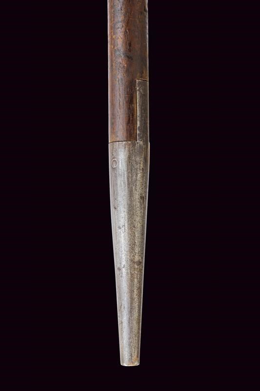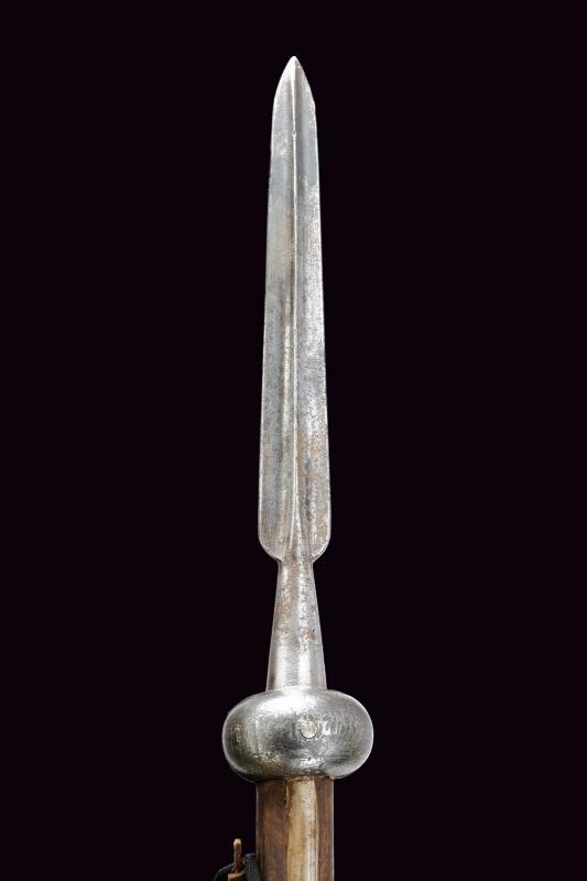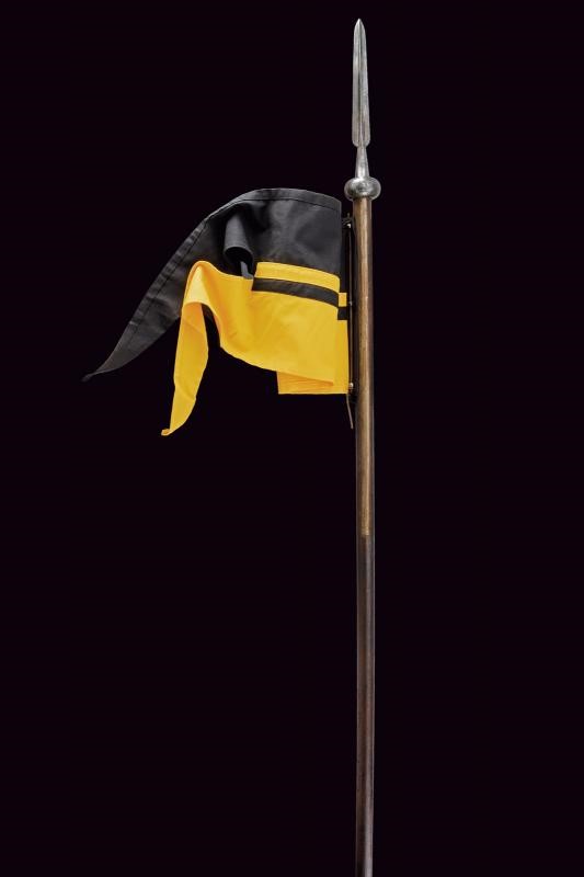 Robusta cuspide a sezione cruciforme su base sferoide marcata "86". Con due bandelle fissate a un fusto cilindrico in legno con piede in ferro. La banderuola è di epoca recente.