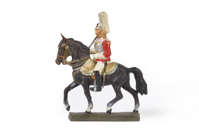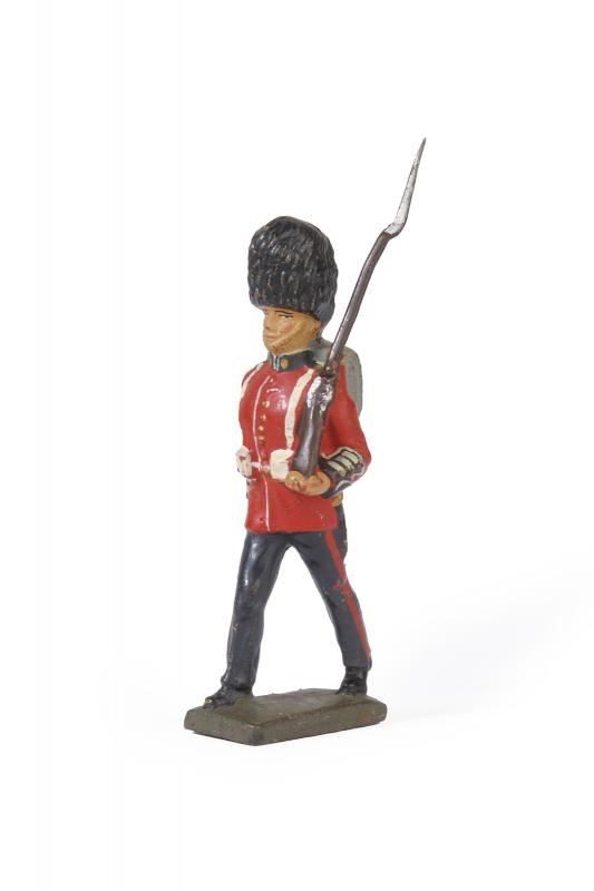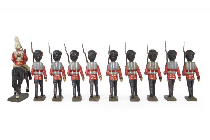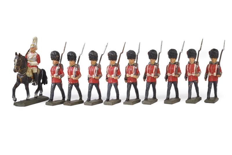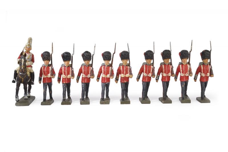 Soldati Inglesi Coldstream e Life Guards. Un ufficiale a cavallo e nove appiedati in marcia con fucile. In pasta; finemente dipinti in policromia, tutti marcati "LINEOL".
