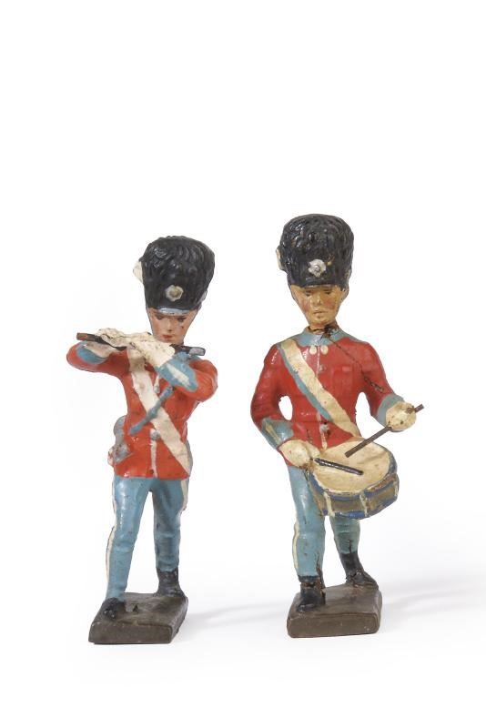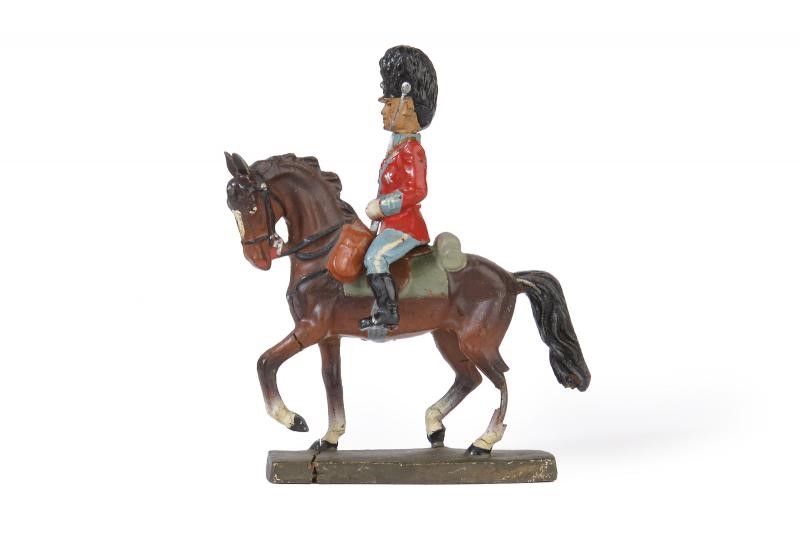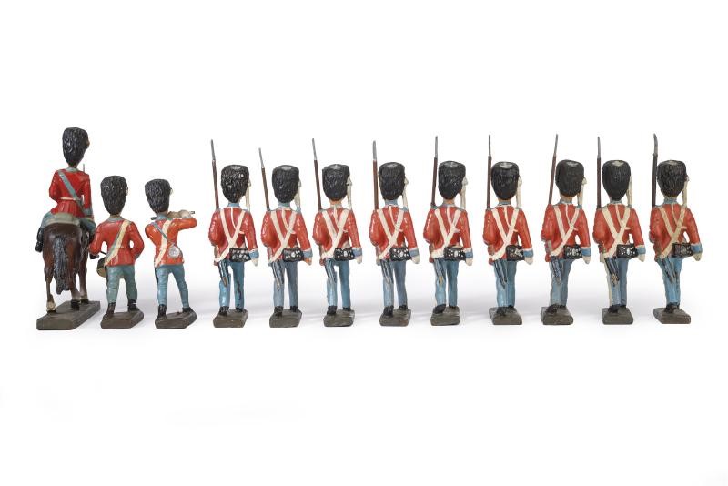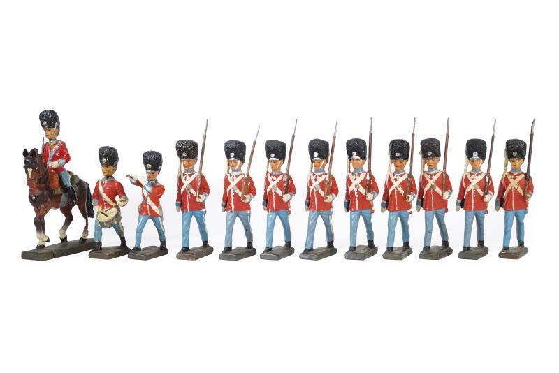 Soldati della Guardia Danese, un ufficiale a cavallo, due musicisti e nove soldati in marcia con fucile. In pasta; finemente dipinti in policromia, tutti marcati "LINEOL".