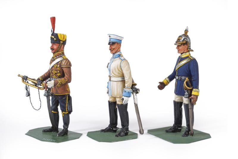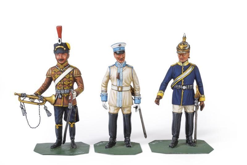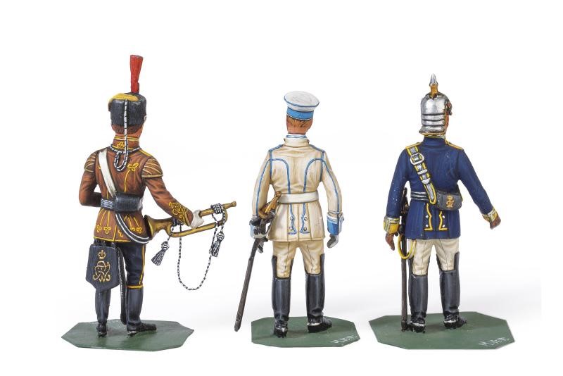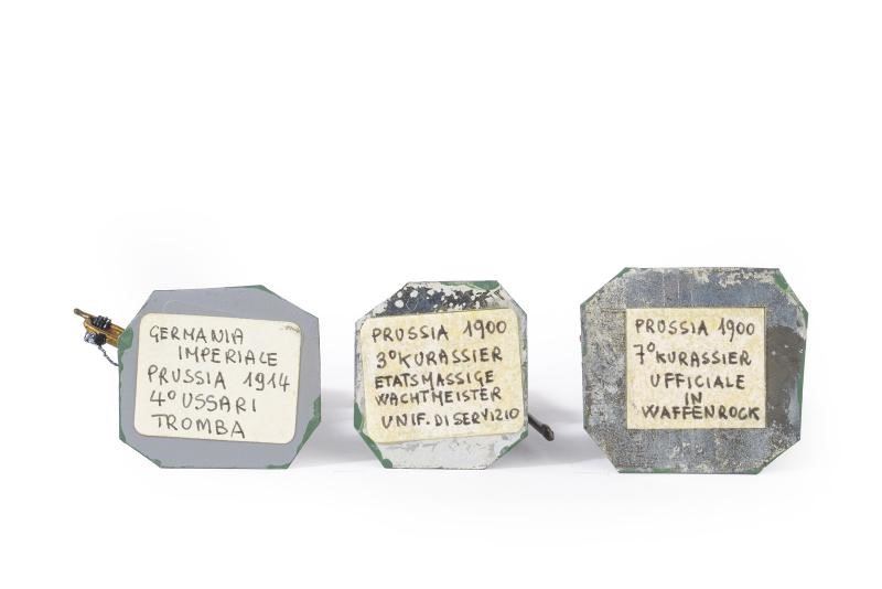 Tre soldati prussiani, un corazziere con elmo del 7° reggimento, uno con berretto del 3° reggimento ed un ussaro del 4° reggimento con tromba. In piombo, finemente dipinti a mano e recanti firma dell'artista.