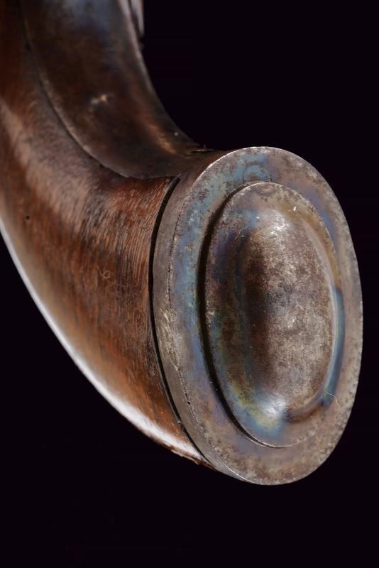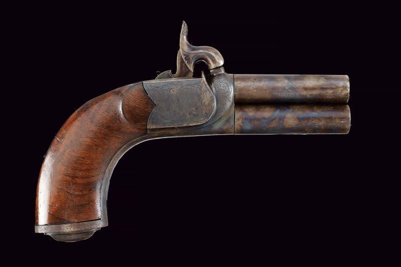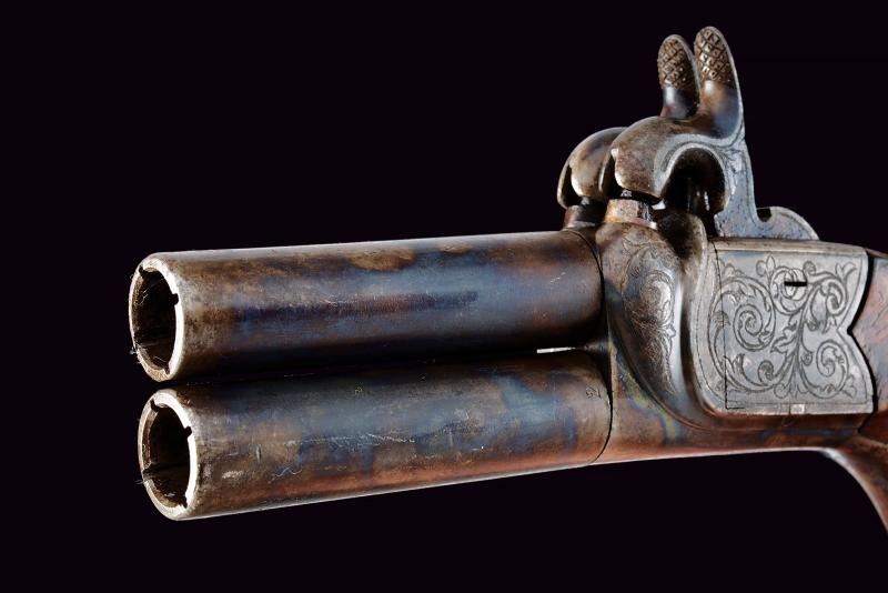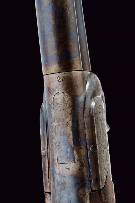 Canne cilindriche del tipo svitabile (bloccate?), cal. 10,7 mm in volata. Castello boxlock con incisioni a racemi, due cani dorsali affiancati. Monogrillo a scomparsa con sistema di fuoco in sequenza dei due percussori (sinistro-destro). meccanica funzionante. Impugnatura in legno (radica?) di noce. Fornimenti in ferro. Resti di tartarugatura forse antica.