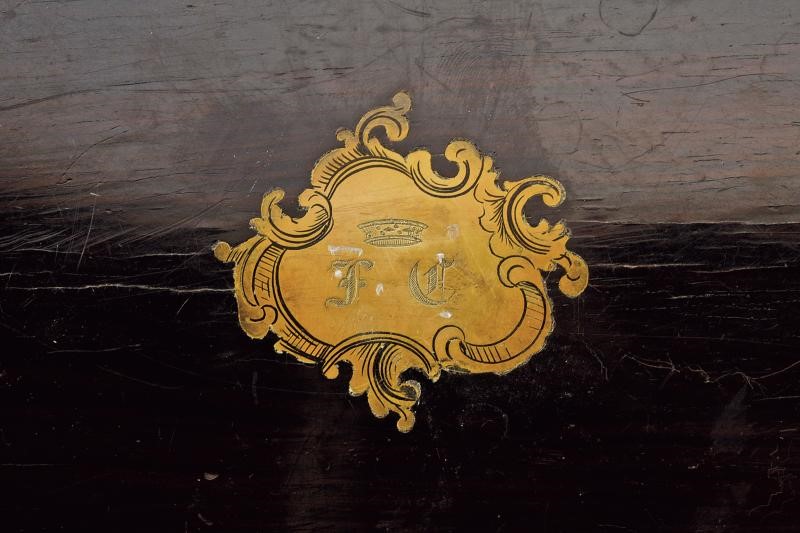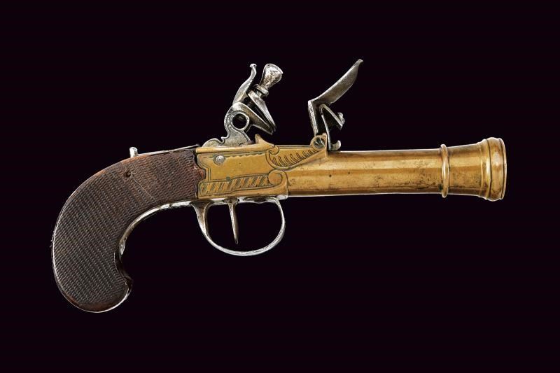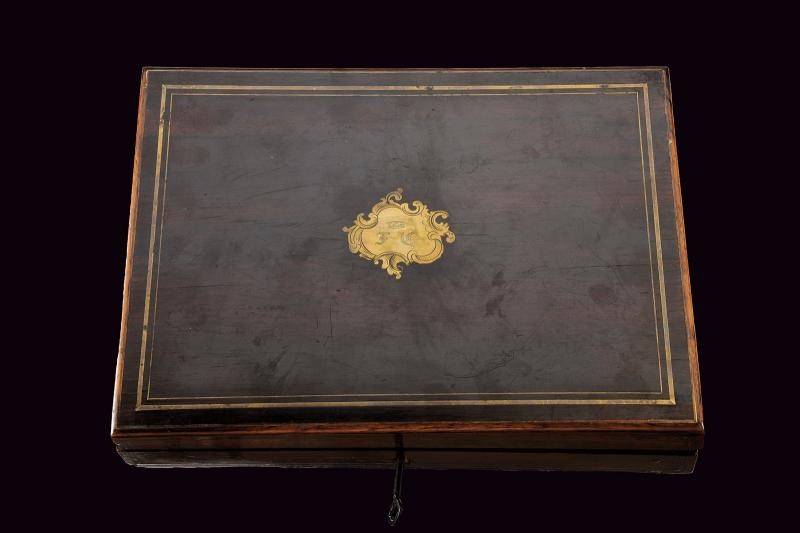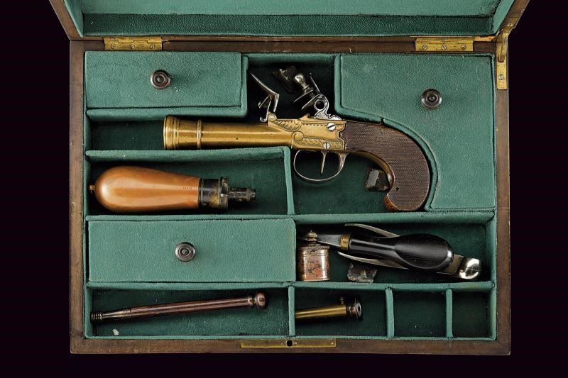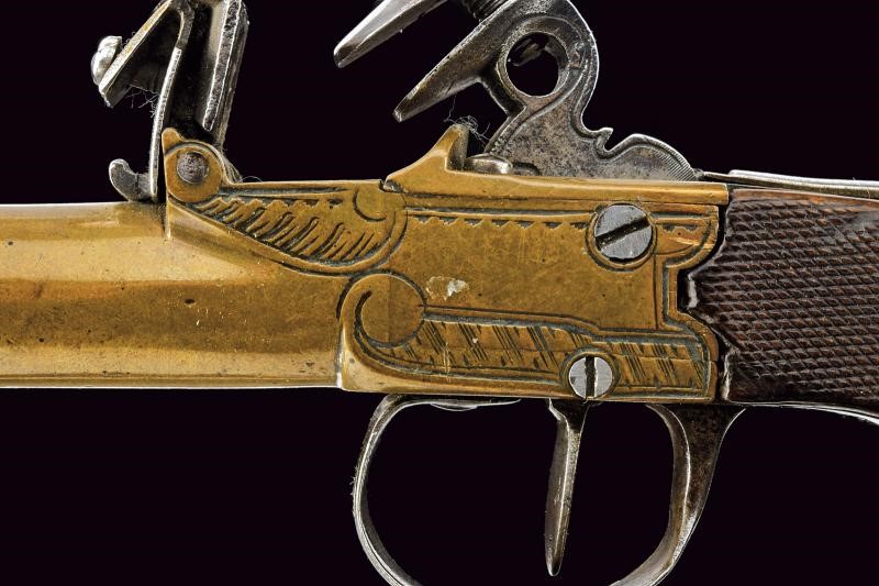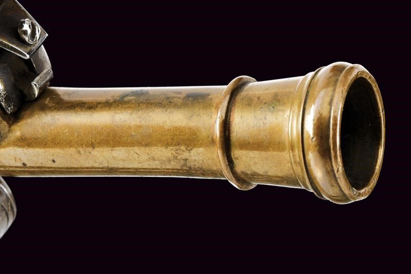 Canna tonda in bronzo con volata ingrossata, realizzata in un solo pezzo con il castello, decorata con incisioni geometriche. Cane, martellina, sicura, ponticello e grilletto in ferro. Calcio in legno micro-zigrinato (piccolo restauro). In cassetta di legno di epoca non pertinente, con fornimenti in ottone e monogramma in lettere gotiche, foderata in panno verde e completa di vari accessori.