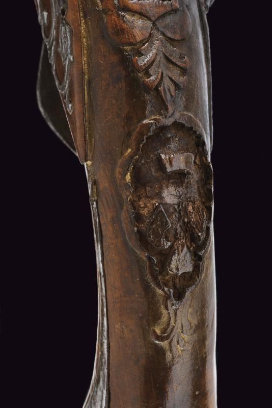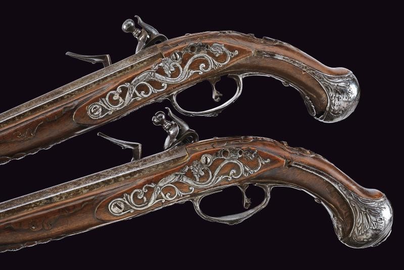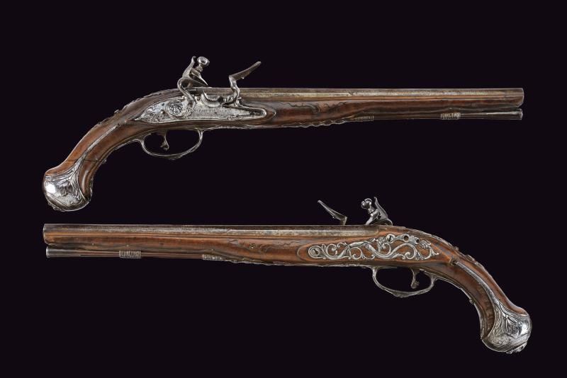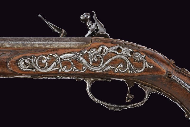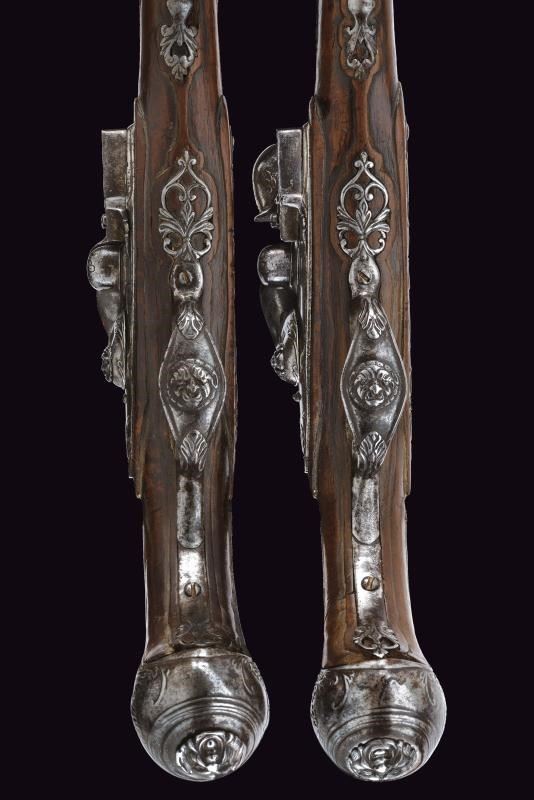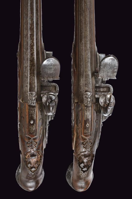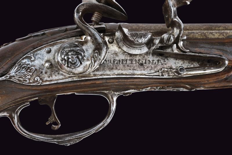 Lunghe canne lisce a due ordini, prima ottagonali poi tonde, con culatta recante un mascherone ad intaglio in bassorilievo e resti di incisioni. Bindelle estese per tutta la lunghezza, interrotte per un breve segmento; visibili resti di firma e di incisioni lungo tutta la superficie; in volata cal. 13 mm. Codette incise. Batterie alla moderna firmate “FIORENTIN IN B.” con cartella ornata a motivi floreali in bassorilievo alla codetta e vite del cane recante mascherone in rilievo. Casse intere in legno (piccoli danni e mancanze), lievemente scolpite. Fornimenti in ferro decorati con mascheroni e motivi floreali in rilievo; contropiastre traforate. Mancano gli scudetti al dorso. Bacchette in legno con battipalla in ferro.