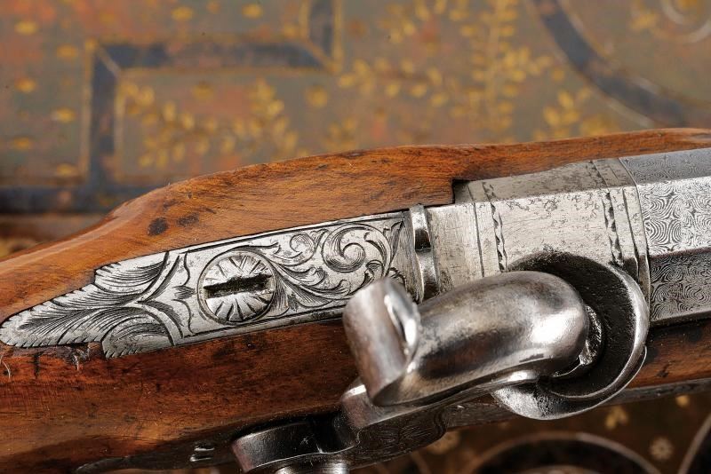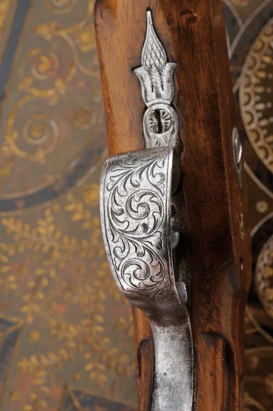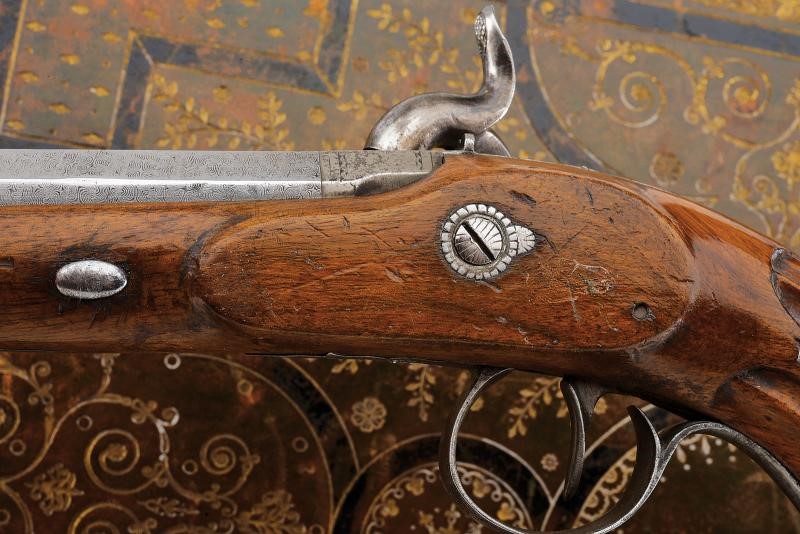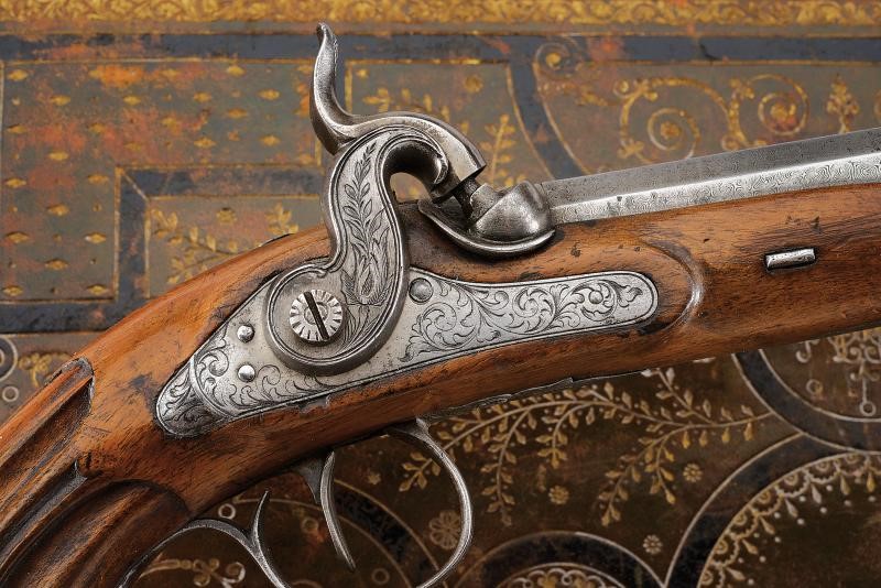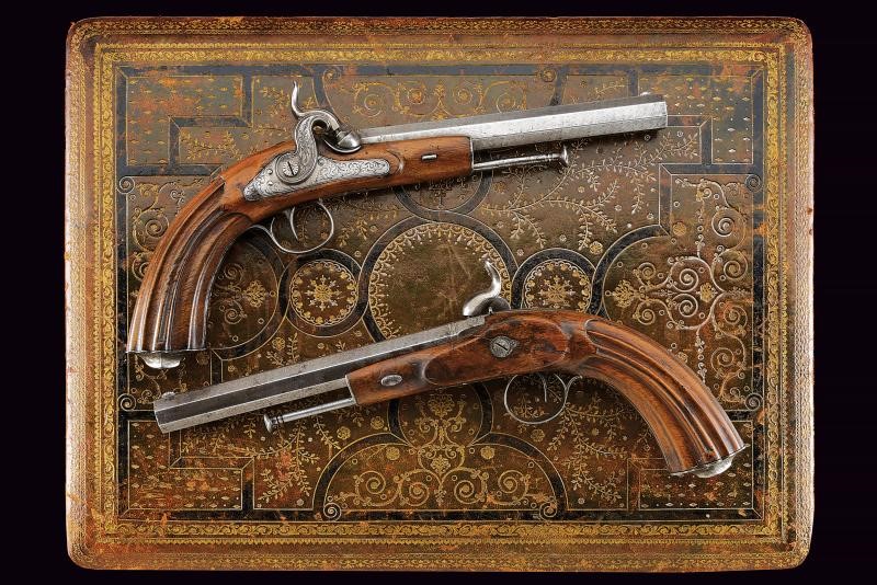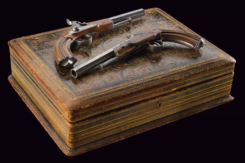 Canne rigate (anime con forte pitting, rigatura visibile), damascate, con cornici alla base e mirino, cal. 14 mm; codette incise e munite di alzo. Piccole batterie a molla in avanti finemente incise a motivi floreali. Casse a tre quarti con impungatura scanalata. Fornimenti in ferro decorati en suite. Bacchette in ferro. Conservate in una bellissima cassetta (non pertinente) rivestita all'esterno di cuoio riccamente inciso e parzialmente dorato. All'interno fodera in velluto verde e dotazione di vari accessori.