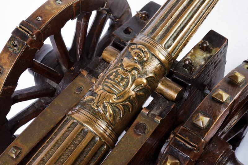 Canne troncoconiche in bronzo. Ingrossate in culatta, poi con un tratto a segmenti sgusciati longitudinali, al centro recante un emblema araldico in rilievo e gli orecchioni, il tratto finale ancora con segmenti longitudinali sgusciati. In volata la gioia di bocca, cal. 14 mm. Pomo di culatta oblungo. Entrambi montati su un lungo affusto ligneo con ruote raggiate e fornimenti in ottone (alcune mancanze). Lunghezza canne 42 cm. Rari in qualità così alta.