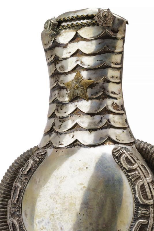 In argento, con una stella; frange rigide in canutiglia argentata. Internamente foderate in velluto color crema (difetti e macchie).