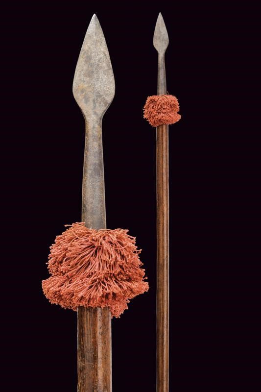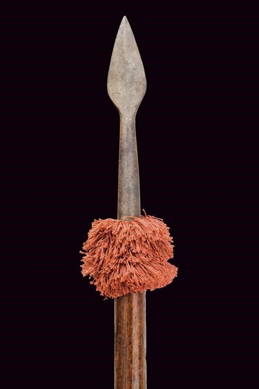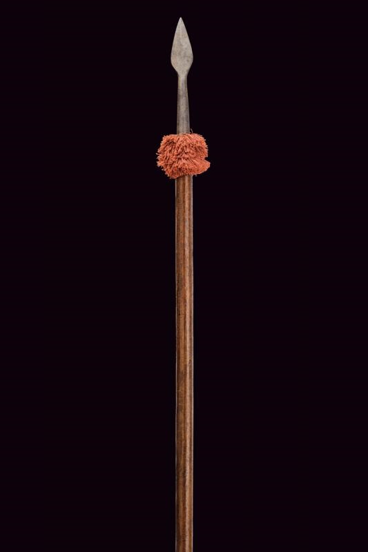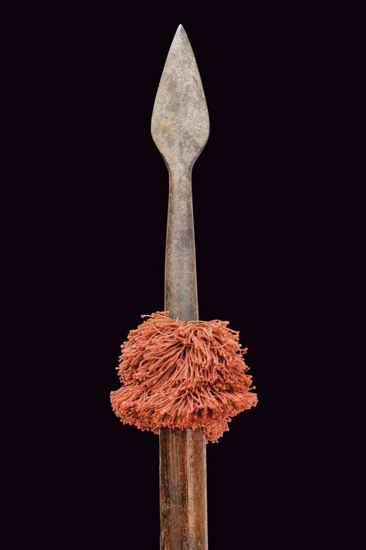 Robusta piccola cuspide in ferro a foglia, costolata in mezzeria, priva di nodo e con gorbia troncoconica. Bandelle non presenti o troncate (parte terminale della gorbia coperta da tessuto). Nappa color porpora. Su asta lignea cilindrica di produzione più recente. Di costruzione semplice, probabilmente del tipo comunemente in uso nelle fanterie europee del XVII secolo.