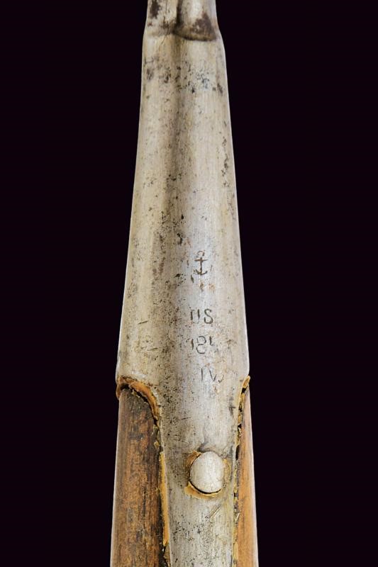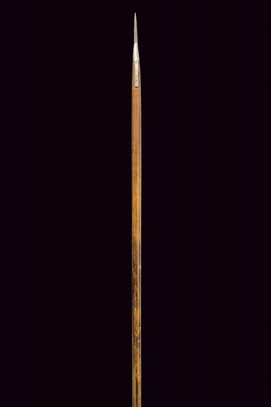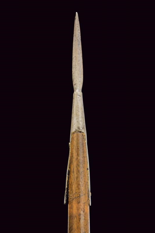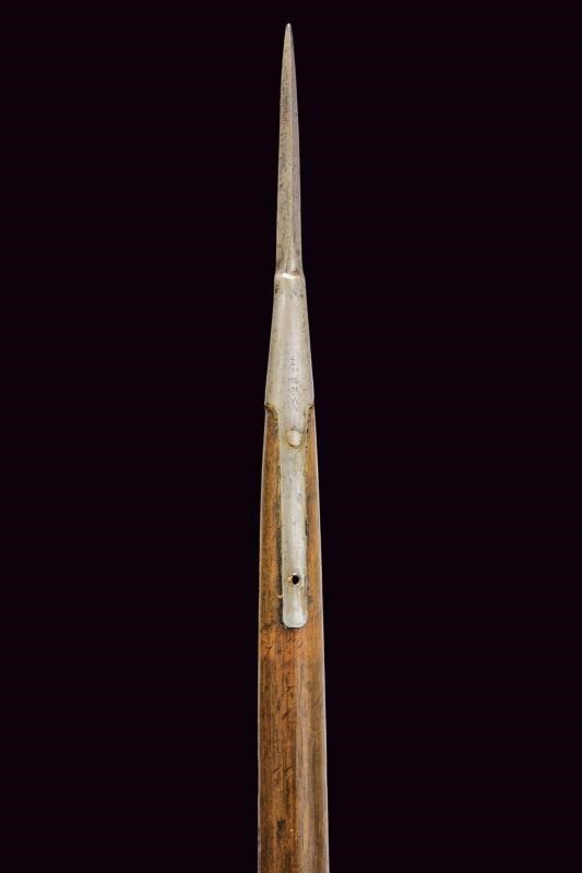 Cuspide a quadrello leggermente lanceolata con breve gorbia troncoconica munita di bandelle; marcatura con resti di effige di àncora, seguita da "US 18..." (il resto non più leggibile). Fusto cilindrico in legno (più tardo?)