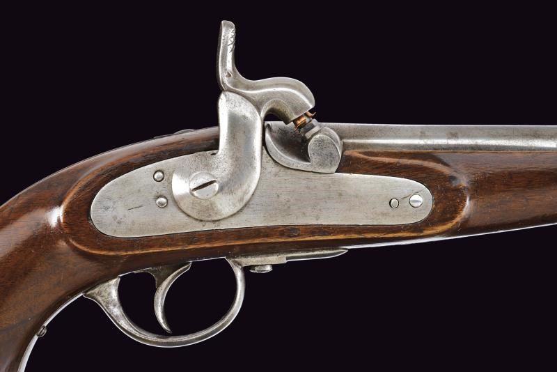 Canna tonda rigata, con leggero pitting, rigatura visibile, dotata di base quadra e scanalatura, mirino; calibro 13,9 mm in volata. Batteria priva di marcature, a molla in avanti, meccanica funzionante a due scatti. Cassa in legno con fornimenti e anello di porta correggiolo in ferro.