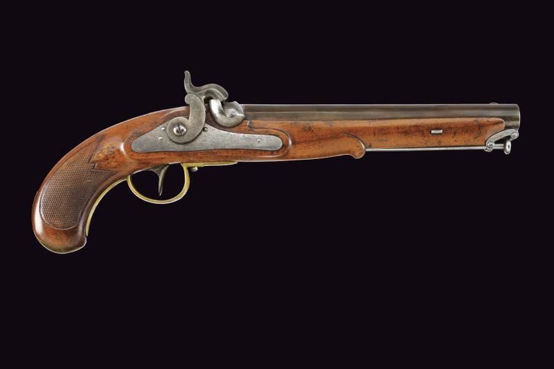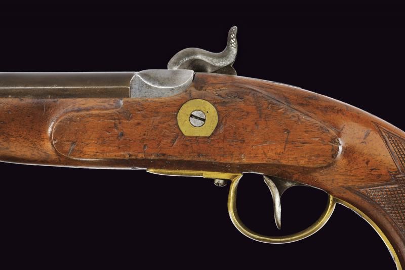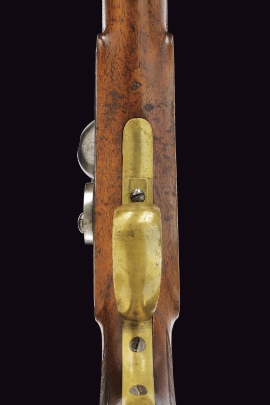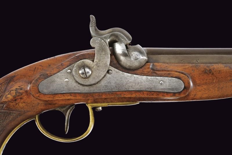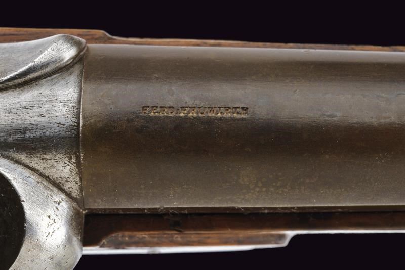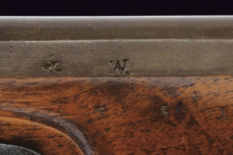 Canna liscia tonda, con base quadra, marcata "FERD. FRUHWIRTH", "W" e con resti dell'aquila bicipite, brunita, dotata di mirino, calibro 17 mm, codetta liscia. Batteria a molla in avanti a cartella piatta, meccanica funzionante a due scatti. Cassa intera in legno con calcio zigrinato, fornimenti in ottone. Bacchetta a snodo in ferro.