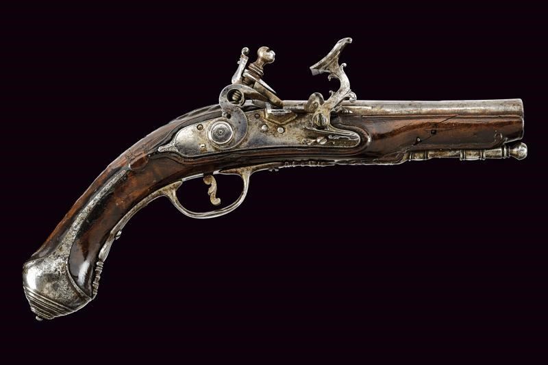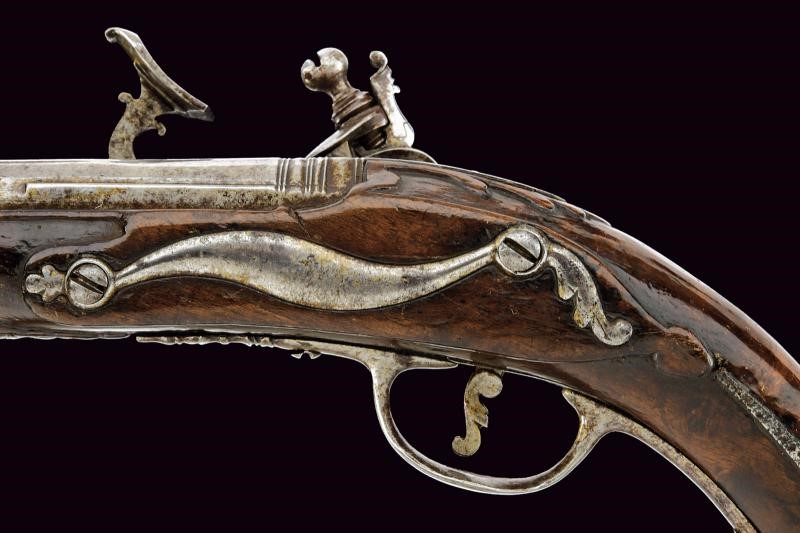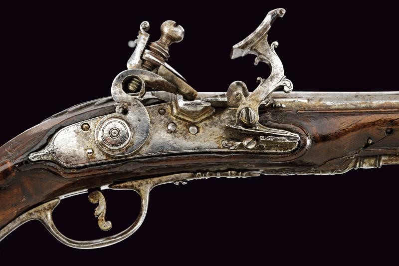 Canna liscia a due ordini, quadra e tonda, priva di cambio, con numerose cornicette alla culatta, percorsa per due terzi da una bindella che termina alla volata, questa in calibro 12.2 mm. Codetta liscia angolata. Batteria alla fiorentina con cartella liscia, collo del cane di forma tondeggiante, collo della martellina piatto e decorato a riccioli; all'interno la firma "G. G. A." (Giuseppe Guardiani Anghiari) e la data "1788" sulla cassetta dello scatto. Cassa intera in legno scuro (crepe al fusto) con fornimenti lisci in ferro; la contropiastra a "S" con profilo leggermente in rilievo. Coccia di forma tondeggiante decorata ad anellature concentriche in rilievo terminati in un piccolo bottone. Bacchetta in ferro con battipalla operato.