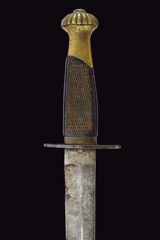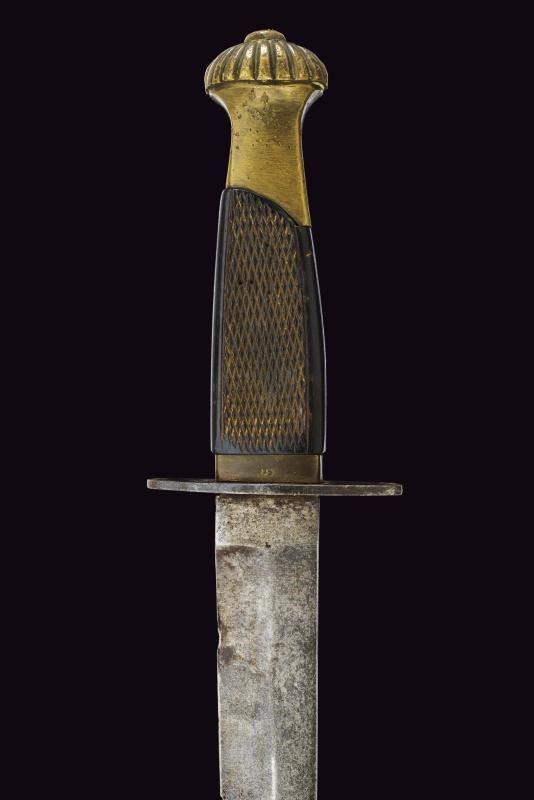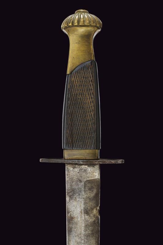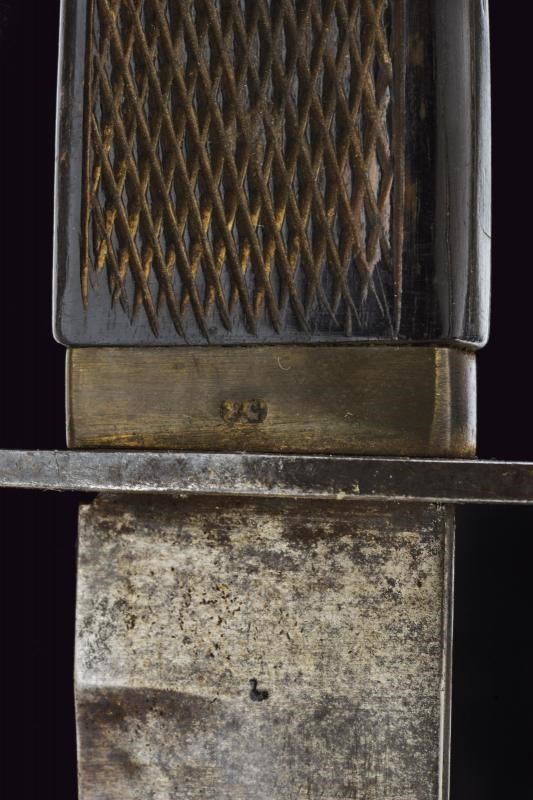 Lama dritta a un filo con breve controfilo e tallone. Impugnatura proveniente da una spada da furieri mod. 1833/66, elso in ferro. Fodero in ferro laccato di nero con passante. Tipico riutilizzo bellico.