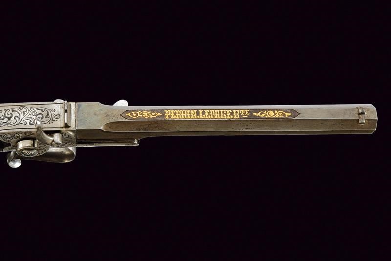 Canna liscia ottagonale, brunita, basculante, con culatta di sezione quadra, firmata in oro "PERRIN LE PAGE B.TE" fra decori floreali sempre in oro, dotata di mirino di precisione, cal. 5 mm. Castello inciso a volute; sul lato sinistro leva d'apertura della canna; il luminello in linea con la canna montato direttamente sul fondello della culatta, completamente protetto quando la canna è in chiusura. Il cane ha la funzionalità di caricare un percussore interno. Calcio in radica scanalata. Ponticello in ferro con poggiadito. Coccia con porta capsule.