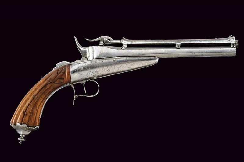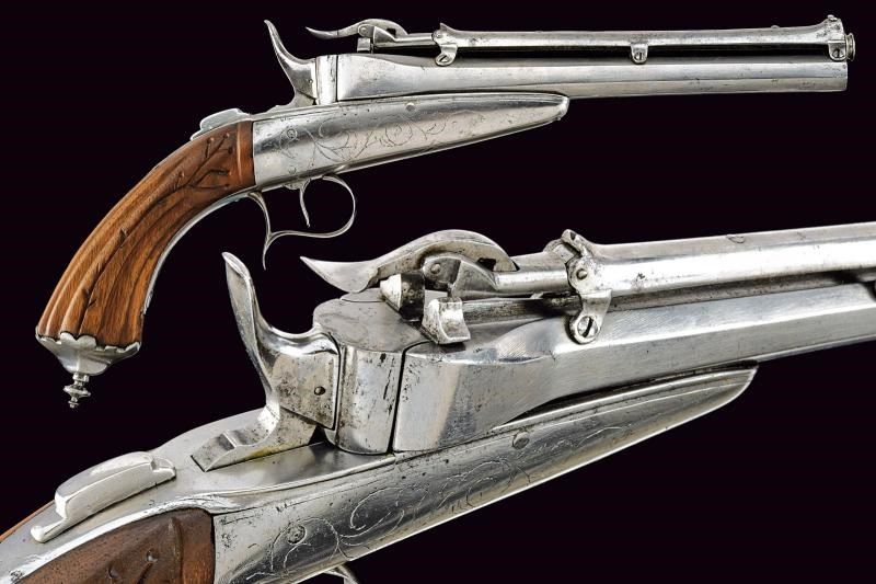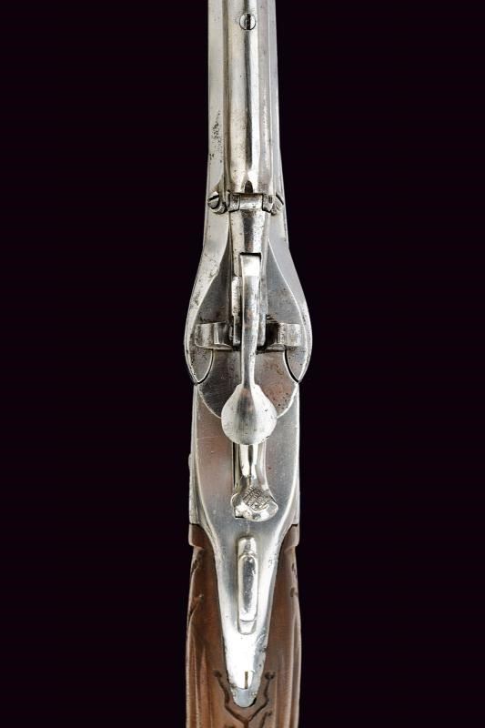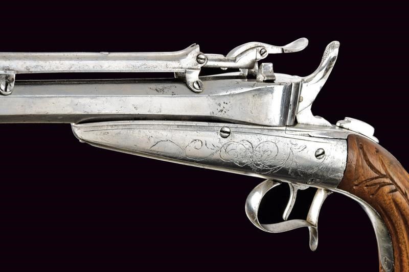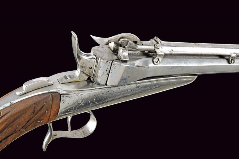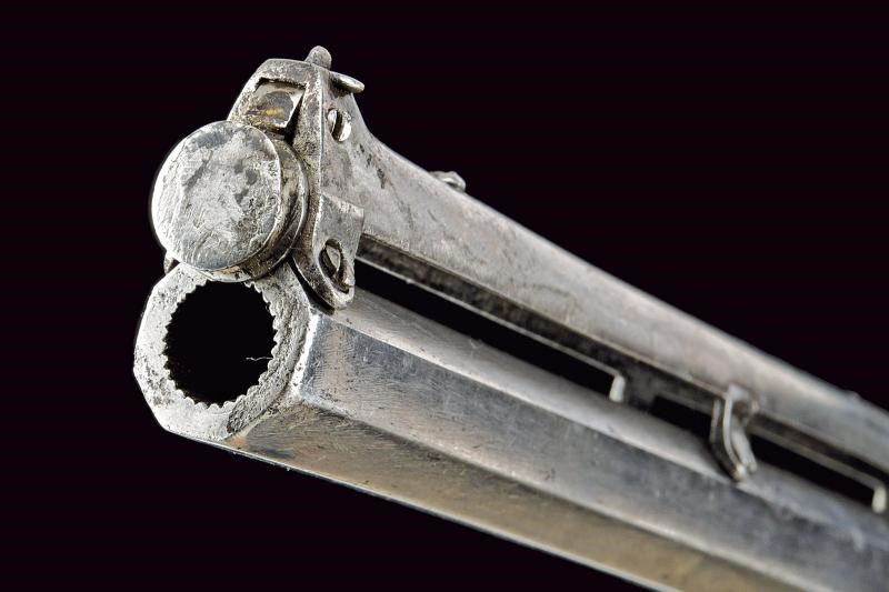 Canna ottagonale, rigata, dotata di serbatoio a gravità al dorso, calibro 10 mm. Castello in acciaio inciso a fiorame munito di sicura. Calcio in legno scanalato, coccia in ferro con bottoncino. Meccanica funzionante ma da rivedere.