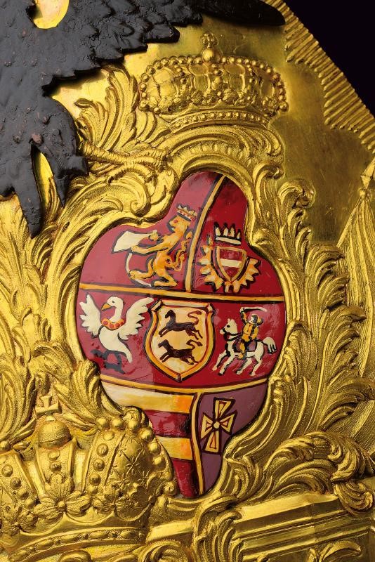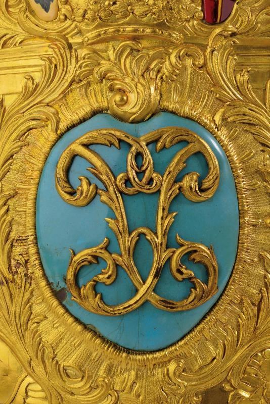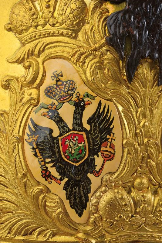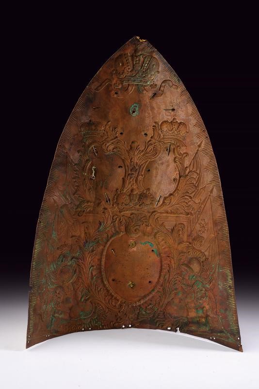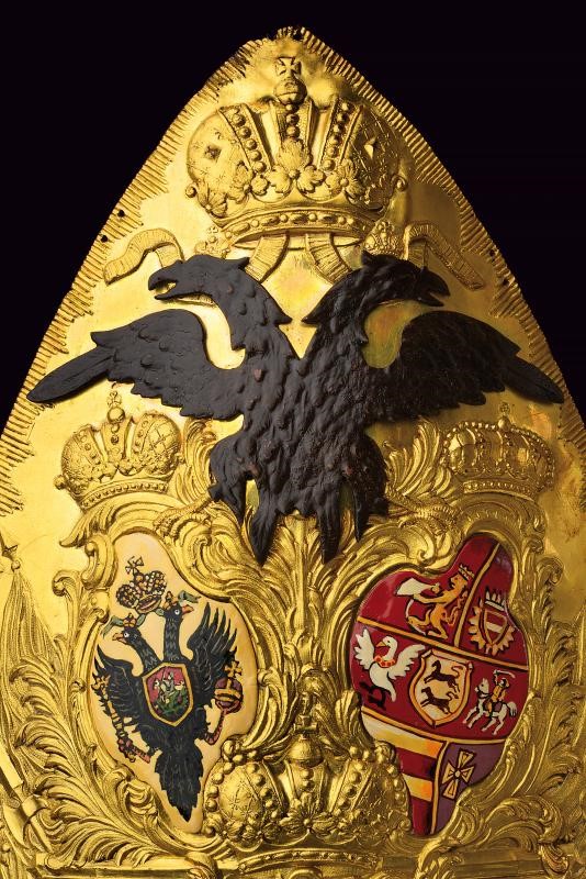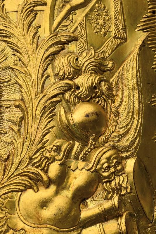 In rame dorato al mercurio, finemente sbalzata con trofei militari e corone. Nella parte superiore un'aquila dipinta di nero sovrasta due placchette: una dipinta con le Armi Schleswig-Holstein; l'altra con l'aquila imperiale Russa. Reatauri ai dipinti. Nella parte inferiore una placchetta smaltata reca il monogramma dorato di Pietro III. Piccoli difetti alla punta e mancanze delle viti delle placche.