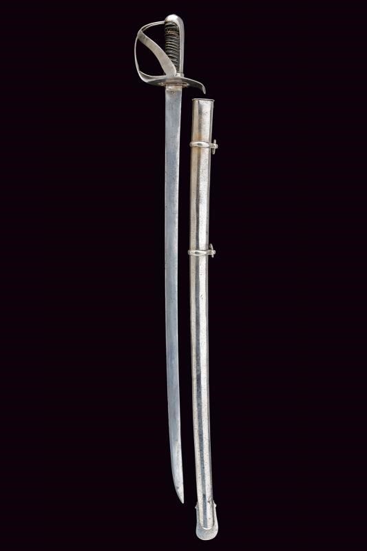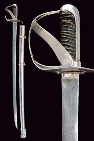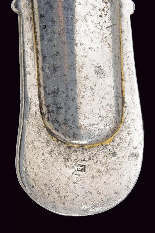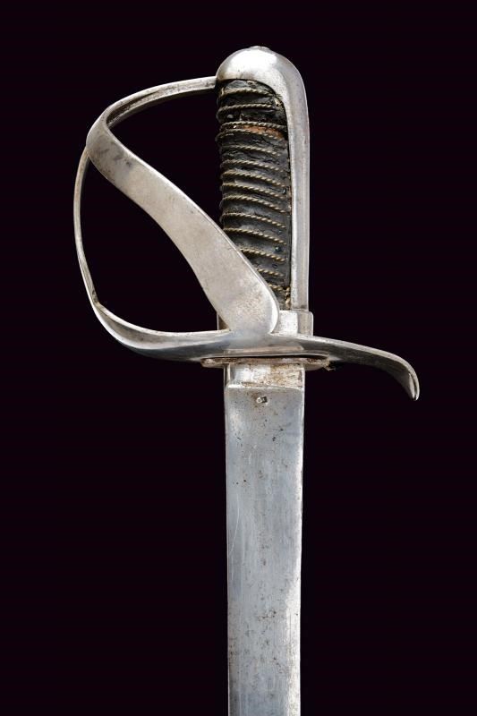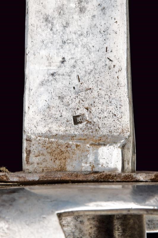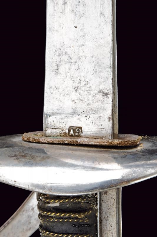 Lama leggermente incurvata a un filo e breve controfilo, recante i punzoni “RF” e “AS” al tallone. Fornimento in ferro con due rami di guardia. Cappetta lunga e liscia. Impugnatura in legno rivestita di cuoio (mancanze) e avvolta da trecciola in filo d'ottone. Completa di fodero in ferro a due campanelle.