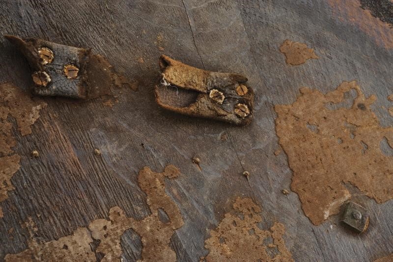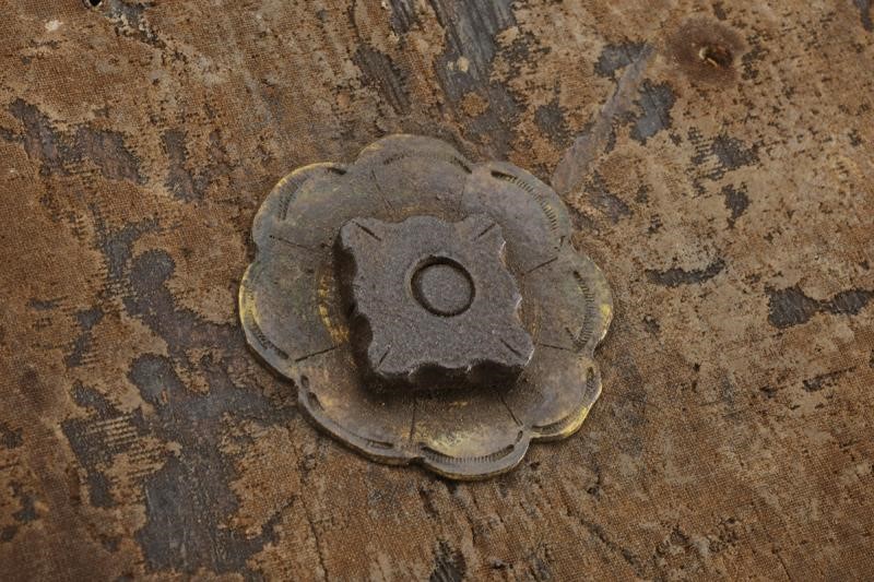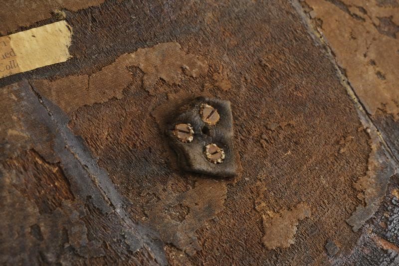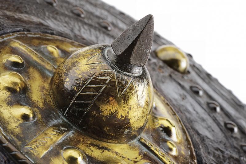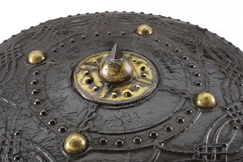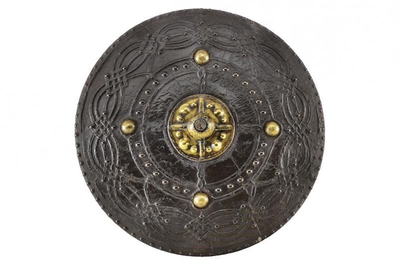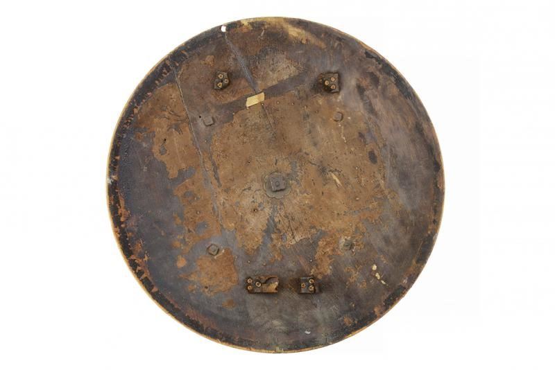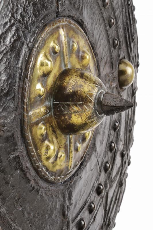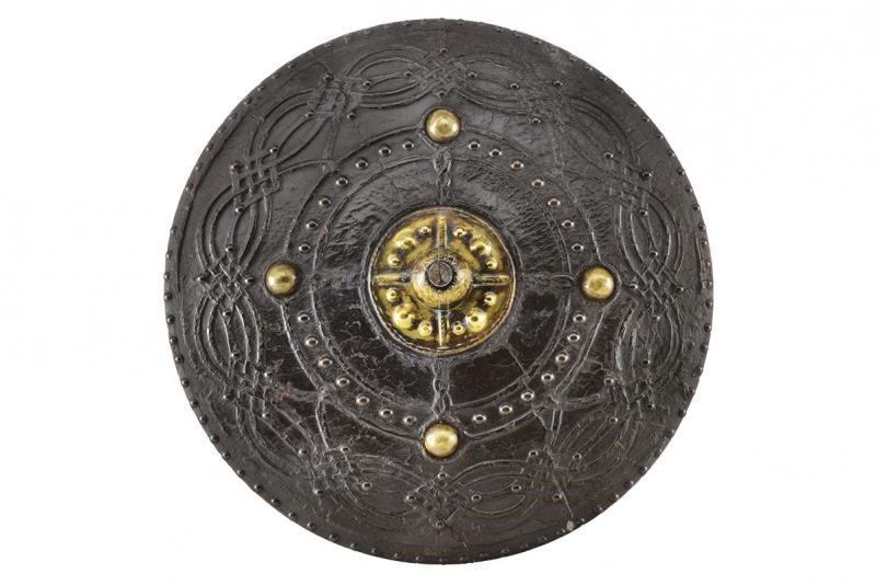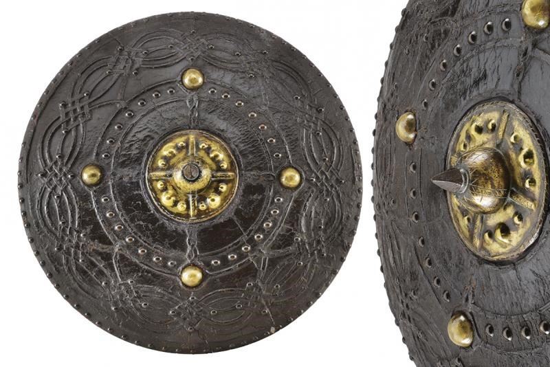 Di forma circolare, a disco, in legno; tutta la superficie esterna rivestita di cuoio (mancanze), con decoro animato da un elegante intreccio di linee ondulate, raccordate da figure romboidali, ai cui vertici sono presenti rivetti, ulteriori chiodature impreziosiscono sia la zona centrale sia il bordo; alla metà del raggio si trovano quattro borchie semisferiche in ottone ai punti cardinali di un settore circolare; al centro una placca in ottone dominata da grossa borchia convessa sormontata da una cuspide in ferro. Il retro con alcune mancanze e segni del tempo, presenta resti delle maniglie in cuoio e resti di etichetta relativa a una vecchia collezione.
