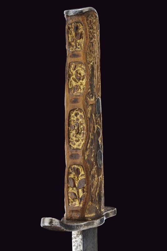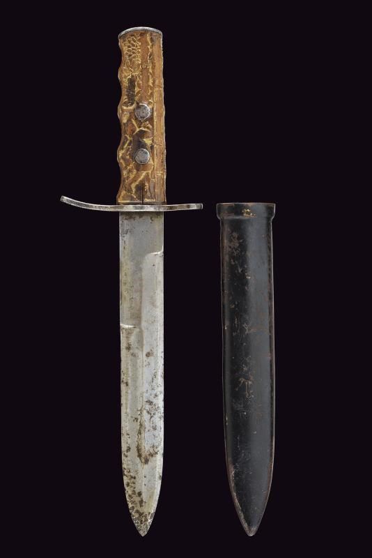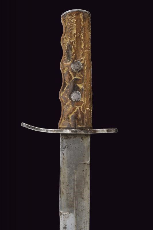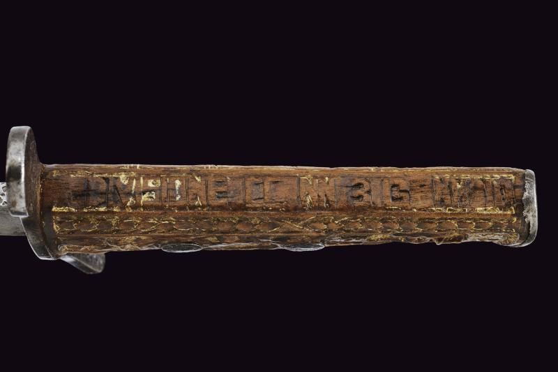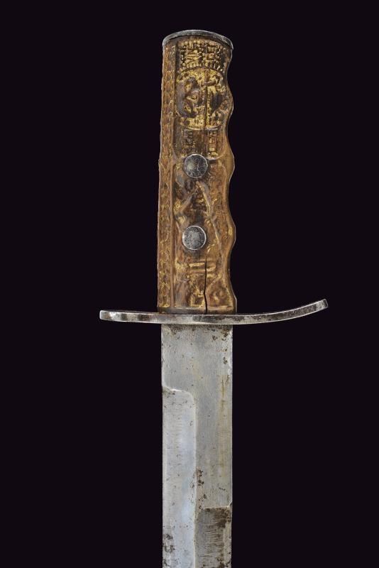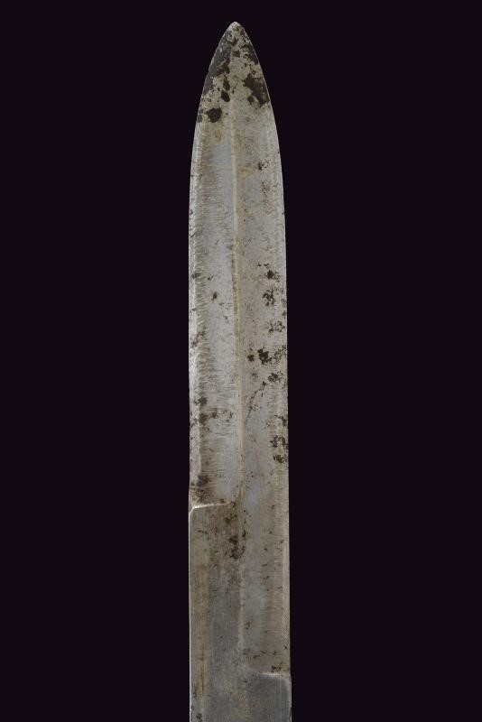Lama dritta a un filo con controfilo. Impugnatura in legno interamente scolpita: su un lato un dromedario entro un paesaggio soprastante una fila di fasci littori, sull'altro un teschio con pugnale e il motto “CHI OSA VINCE”, incorniciato da decori a palmette. Un lato presenta l'iscrizione “DIVISIONE CC.NN. 3 GENNAIO”. Elso e cappetta in ferro. Fodero in ferro dipinto di nero con passante.