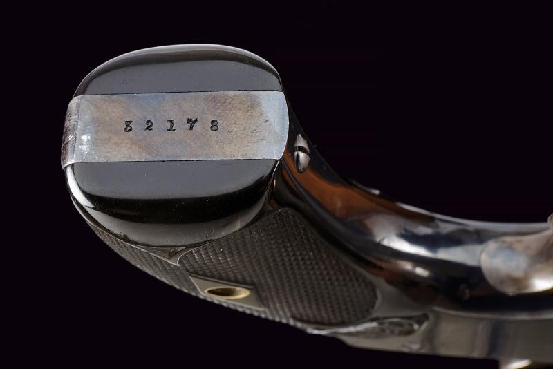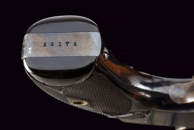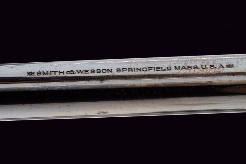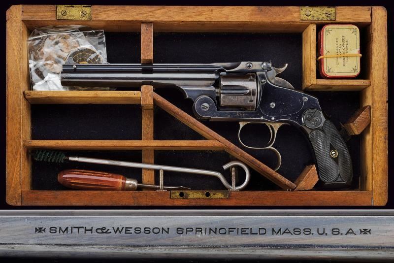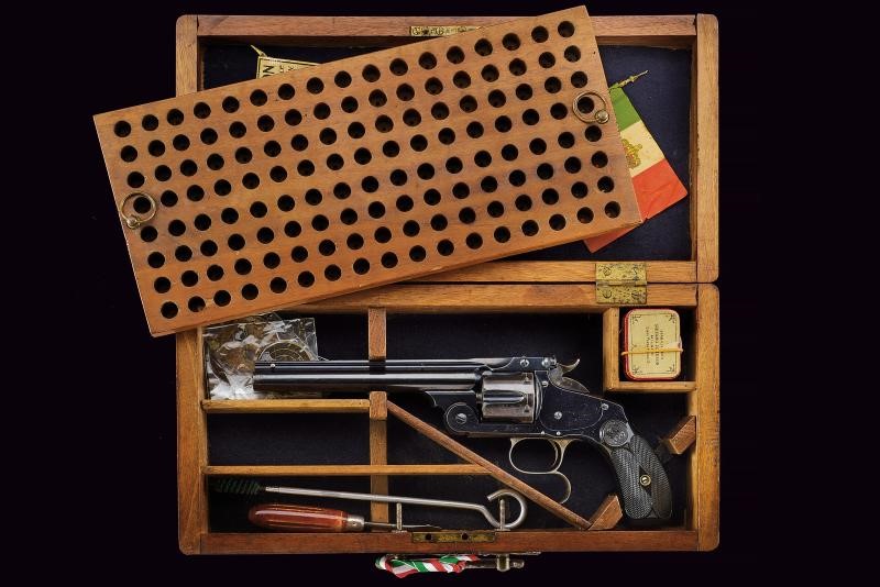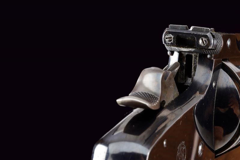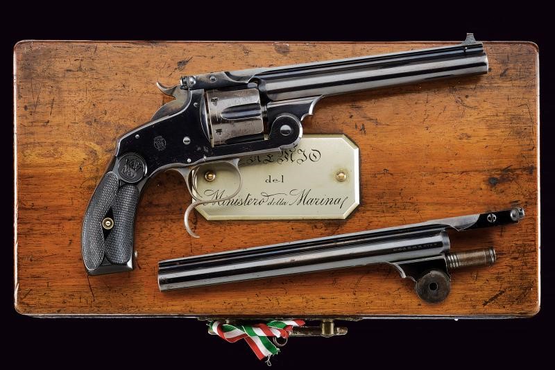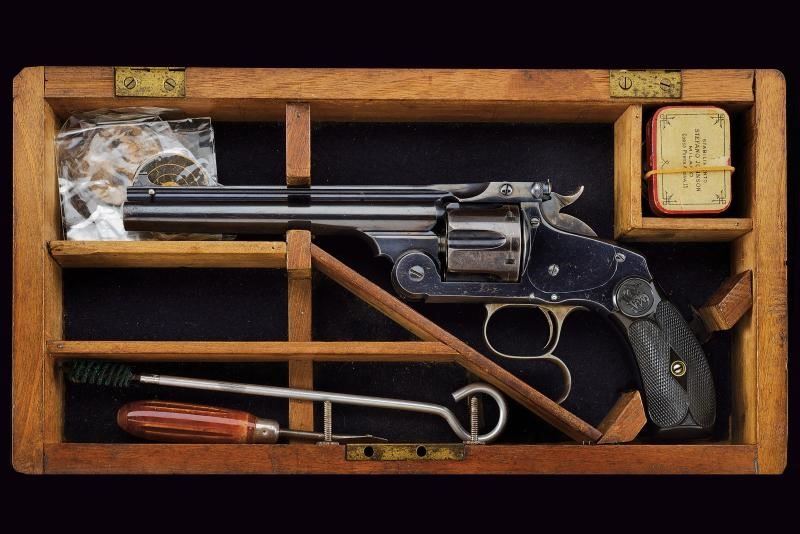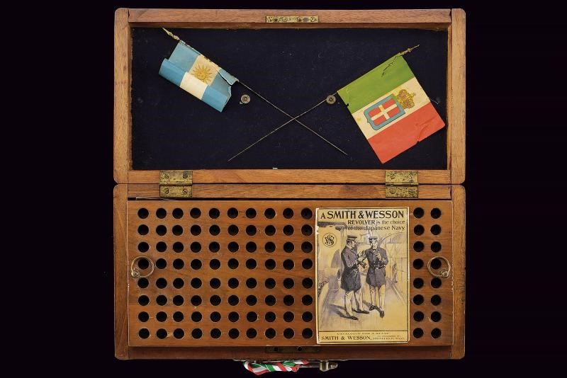 Canna da 6-1/2 pollici, dotata di mirino da tiro al bersaglio, munito di spina per smontaggio rapido; al dorso della bindella marcata con indirizzo della ditta fra crocette. Tacca di mira da tiro con viti di regolazione, montata sul gancetto della canna. Tamburo a sei colpi. Meccanica ben funzionante. Anima a specchio, in ottime condizioni. Castello con marchio della ditta sul fianco destro. Ponticello del tipo Russian, munito di poggiadito (Special Order). Guancette in bachelite zigrinata con marchio "S&W". Conserva il 90% della brunitura antica. Ponticello e cane con resti di tartarugatura. Calibro 44 S&W Russian. Dotata di rarissima canna aggiuntiva da 8 pollici; anche questa con anima in ottime condizioni, come anche lo stato della brunitura; presenta la medesima marcatura dorsale dell'altra canna ed è munita anche della dicitura del calibro sul fianco sinistro. Matricola "321xx" coeva su impugnatura, tamburo, canna da 6-1/2 pollici e sul suo gancetto; la canna lunga invece priva di matricola e con gancetto con numerazione differente. Il revolver è conservato in una cassetta di produzione antica, in legno a due ripiani. Il primo con alloggiamento per le munizioni (presenti alcuni bossoli privi di innesco), il secondo ripiano con l'alloggiamento per il revolver e una serie di accessori. Di notevole interesse fra gli accessori di produzione antica, grilletti di ricambio, tacche di mira di altezze differenti e mirini di varie fogge ed altezze. Interessanti anche alcuni bersagli anitchi sparati con date e firme del tiratore. All'interno del coperchio fodera in panno blu e due bandiere in carta incrociate, una del regno d'Italia e una dell'Argentina. Coperchio con placca in metallo bianco recante l'iscrizione "Premio del Ministero della Marina".