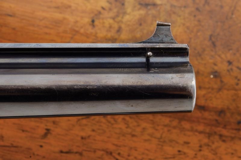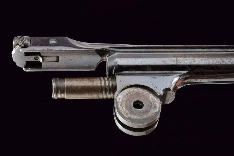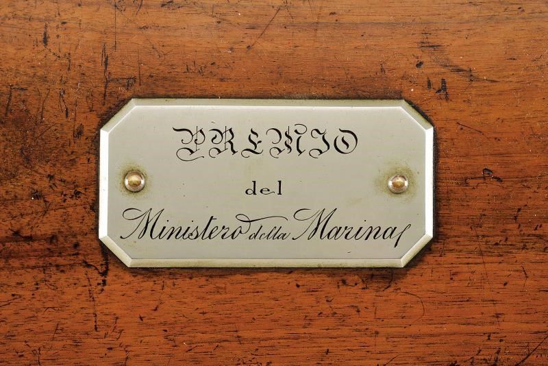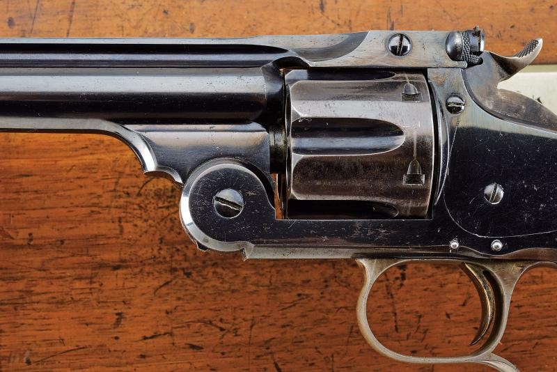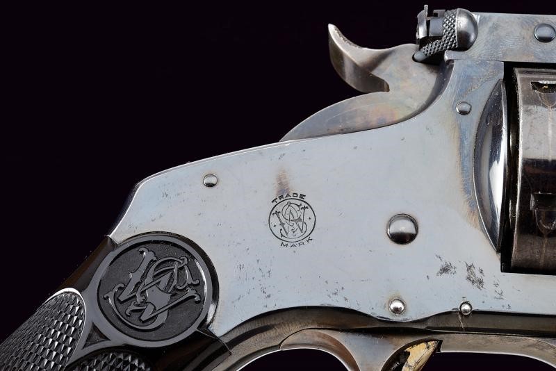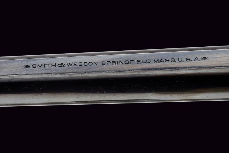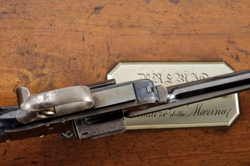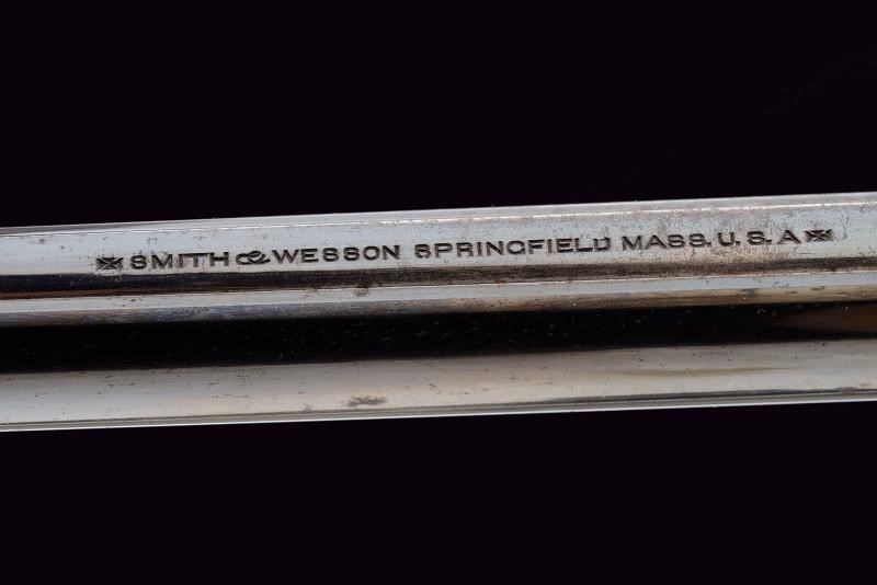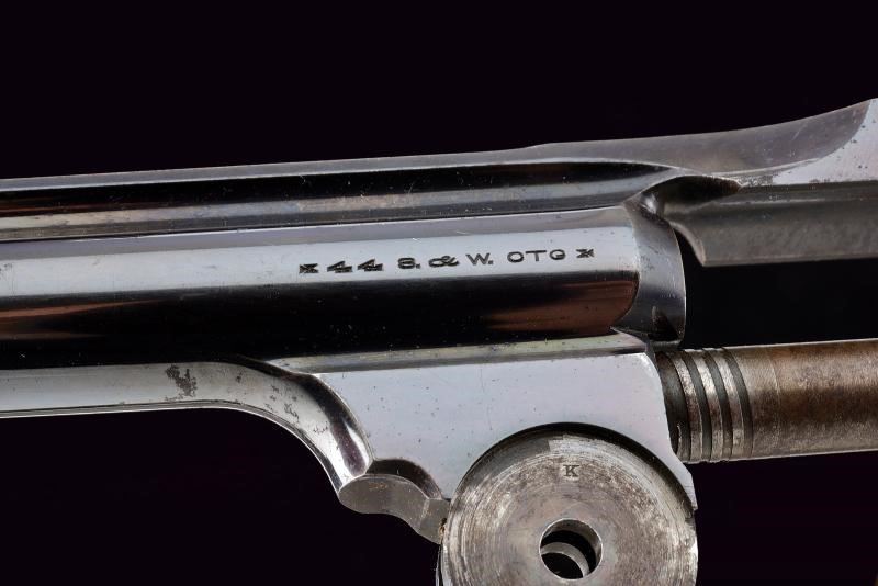 Canna da 6-1/2 pollici, dotata di mirino da tiro al bersaglio, munito di spina per smontaggio rapido; al dorso della bindella marcata con indirizzo della ditta fra crocette. Tacca di mira da tiro con viti di regolazione, montata sul gancetto della canna. Tamburo a sei colpi. Meccanica ben funzionante. Anima a specchio, in ottime condizioni. Castello con marchio della ditta sul fianco destro. Ponticello del tipo Russian, munito di poggiadito (Special Order). Guancette in bachelite zigrinata con marchio "S&W". Conserva il 90% della brunitura antica. Ponticello e cane con resti di tartarugatura. Calibro 44 S&W Russian. Dotata di rarissima canna aggiuntiva da 8 pollici; anche questa con anima in ottime condizioni, come anche lo stato della brunitura; presenta la medesima marcatura dorsale dell'altra canna ed è munita anche della dicitura del calibro sul fianco sinistro. Matricola "321xx" coeva su impugnatura, tamburo, canna da 6-1/2 pollici e sul suo gancetto; la canna lunga invece priva di matricola e con gancetto con numerazione differente. Il revolver è conservato in una cassetta di produzione antica, in legno a due ripiani. Il primo con alloggiamento per le munizioni (presenti alcuni bossoli privi di innesco), il secondo ripiano con l'alloggiamento per il revolver e una serie di accessori. Di notevole interesse fra gli accessori di produzione antica, grilletti di ricambio, tacche di mira di altezze differenti e mirini di varie fogge ed altezze. Interessanti anche alcuni bersagli anitchi sparati con date e firme del tiratore. All'interno del coperchio fodera in panno blu e due bandiere in carta incrociate, una del regno d'Italia e una dell'Argentina. Coperchio con placca in metallo bianco recante l'iscrizione "Premio del Ministero della Marina".