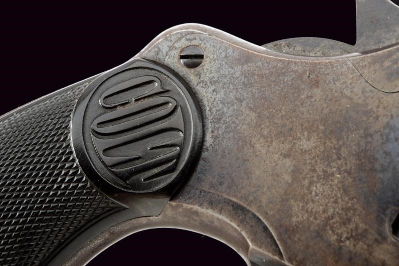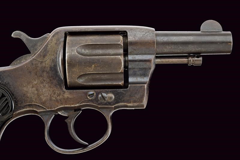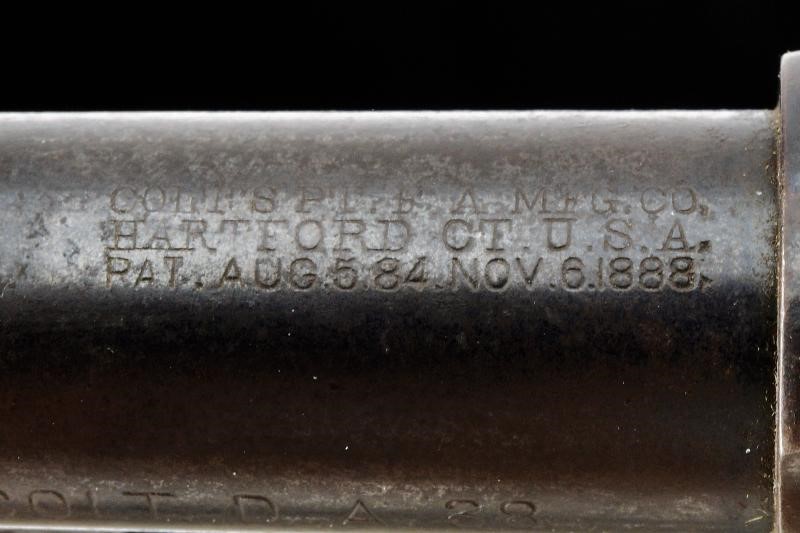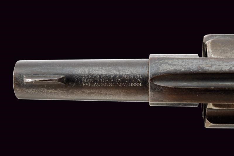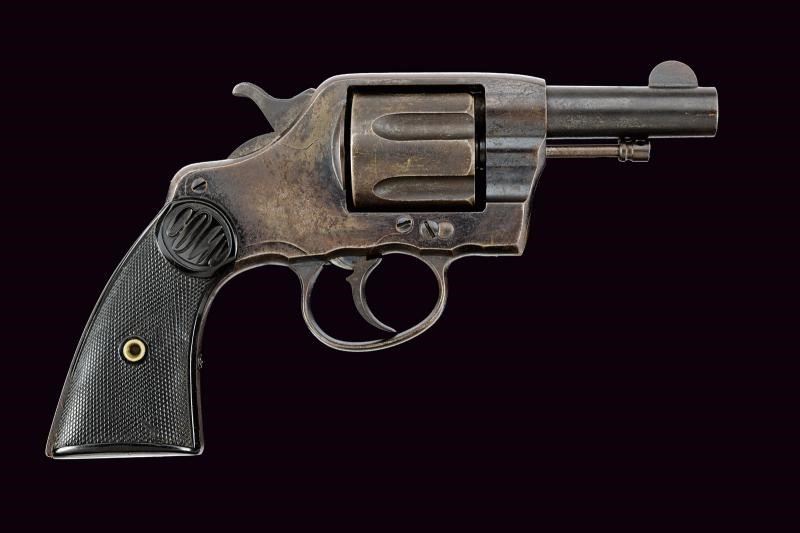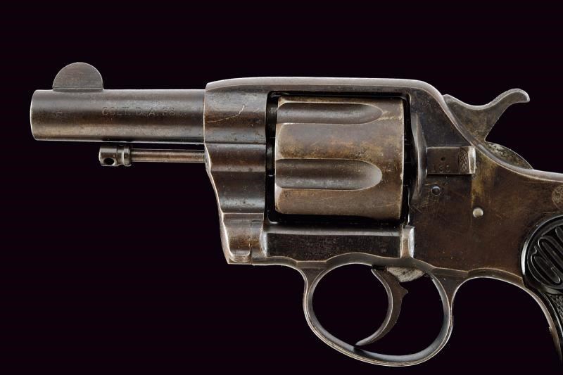 Canna cilindrica rigata, da 3", dotata di mirino, con marcatura dorsale recante indirizzo della ditta e brevetto del 1888 in tre righe, marcatura laterale con dicitura del calibro/modello "COLT D.A. 38". Anima pulita, rigatura visibile, lievi segni d'uso all'interno. Tamburo a sei colpi, sgusci lunghi e senza arresti, rotazione in senso antiorario (elementi tipici del modello). Meccanica ben funzionante, in azione mista. Castello con cavallino rampante sul fianco sinistro. Numeri di assemblaggio visibili coevi. Matr. "31xxx" sul fondo dell'impugnatura. Guancette in gommadura zigrinata con piccole mancanze e dicitura "COLT" in alto. Qualche zona con lievi intaccature. Resti di brunitura, probabilmente antica, al 30% circa.