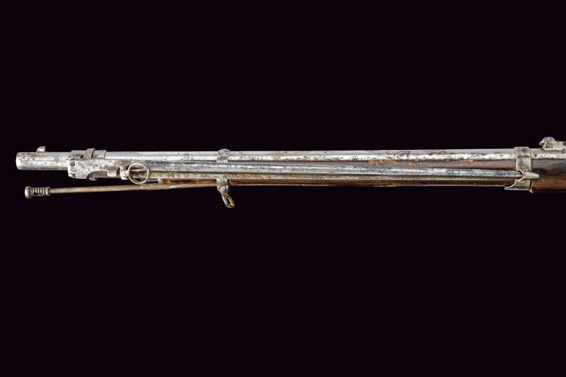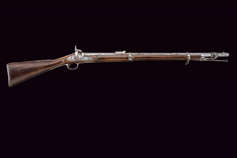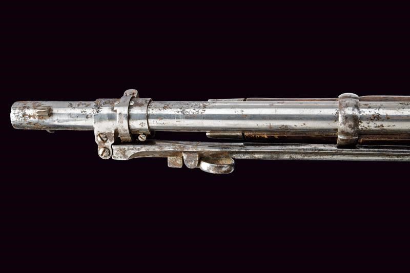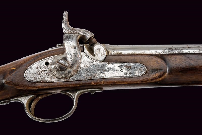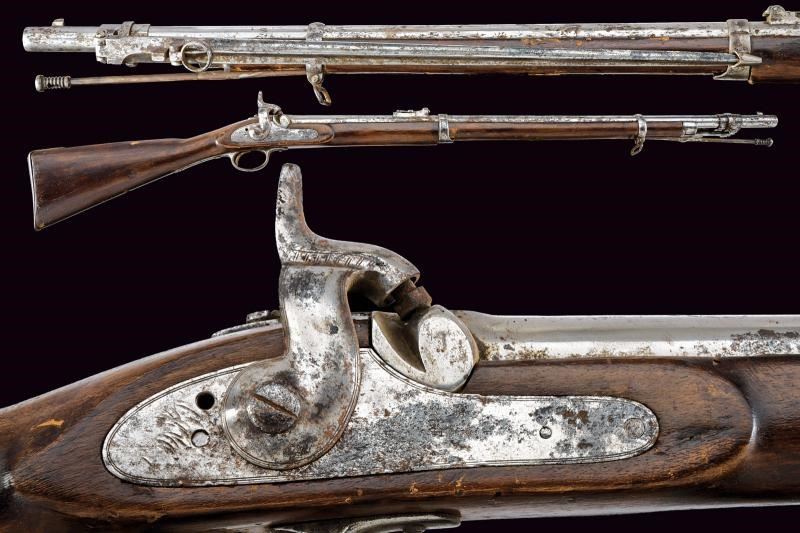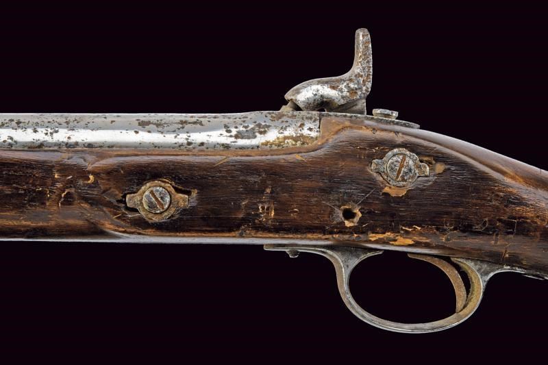 Fucile del tipo inglese (sul modello P53). Canna tonda con lievi tracce di rigatura all'interno, dotata di mirino e con alzo abbattibile e regolabile. Svariate intaccature. Cal. 14,9 mm. in volata (.58?) Nell'ultimo segmento è montata una baionetta a manicotto, con perno di sicurezza che ne evita l'estrazione dalla canna. La baionetta è dotata di una lama pieghevole e di un anello di ritenzione: facendo scorrere avanti la ghiera e girando la baionetta in posizione avanzata è poi possibile inserire l'anello alla volata assicurando la lama in posizione pronta all'uso. Quando la baionetta viene nuovamente ripiegata sul fianco (sinistro) dell'arma è disponibile un apposito alloggiamento, ricavato in un reggicanna, per tratterne la punta in posizione ripiegata. Cassa del fucile lunga, in legno, con danni e restauri. Fornimenti in ferro senza punzoni visibili. bacchetta in ferro. Difetti, intaccature, segni d'uso e del tempo. Stato di conservazione da medio a mediocre. Lama baionetta 50,5 cm. Probabilmente un modello sperimentale.
