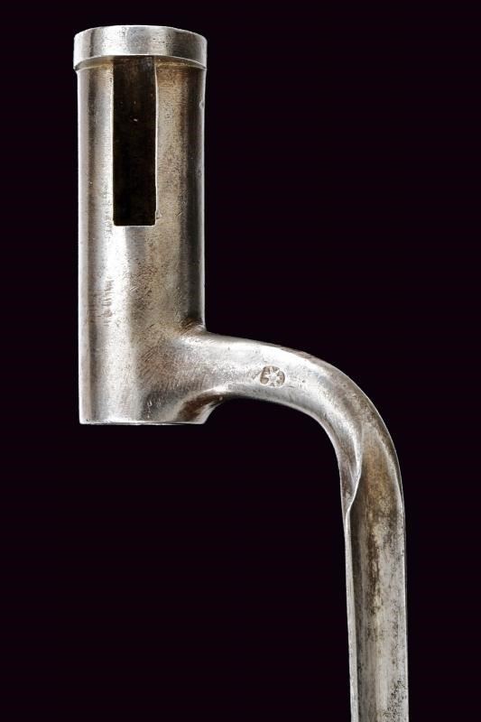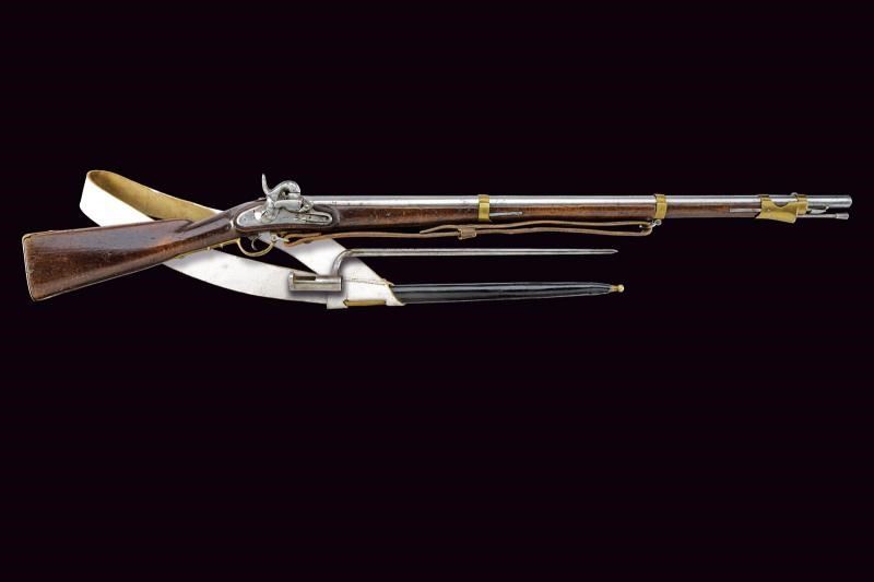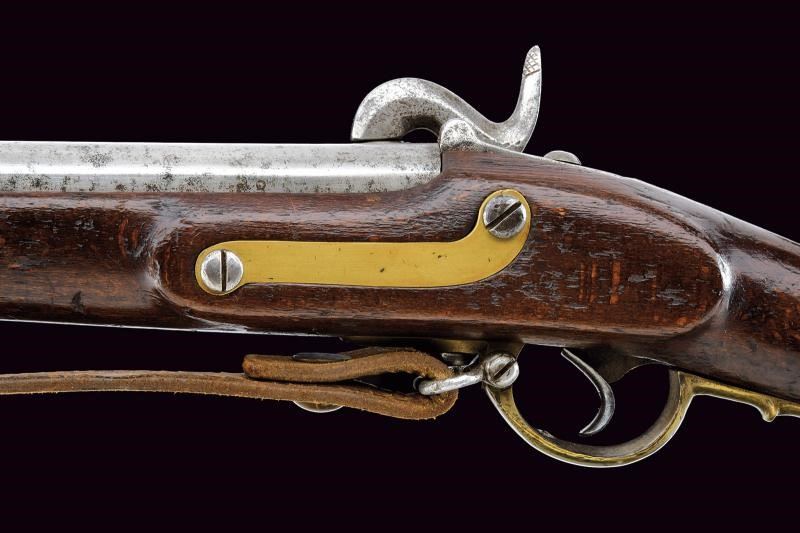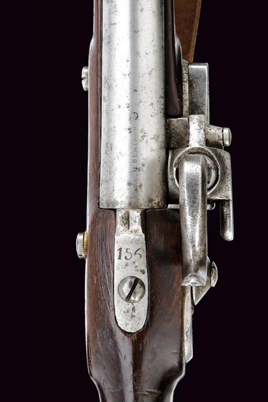 Canna liscia tonda, con base quadra marcata “G. BENTZ”, “39” e con altri punzoni sui lati; mirino e attacco per la baionetta; calibro 13,5 mm. Codetta con alzo fisso, marcata “156”. Batteria sistema Augustin, funzionante a due scatti, datata “853” e recante punzone “B”. Cassa intera in legno, con fornimenti e bacchetta in ferro. Cinghia in cuoio. Completa della sua baionetta in ferro, con fodero in cuoio e fornimenti in ferro, e con taschetta in cuoio dipinto di bianco.