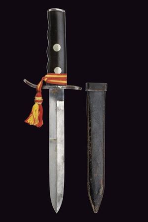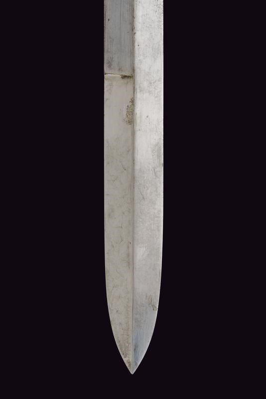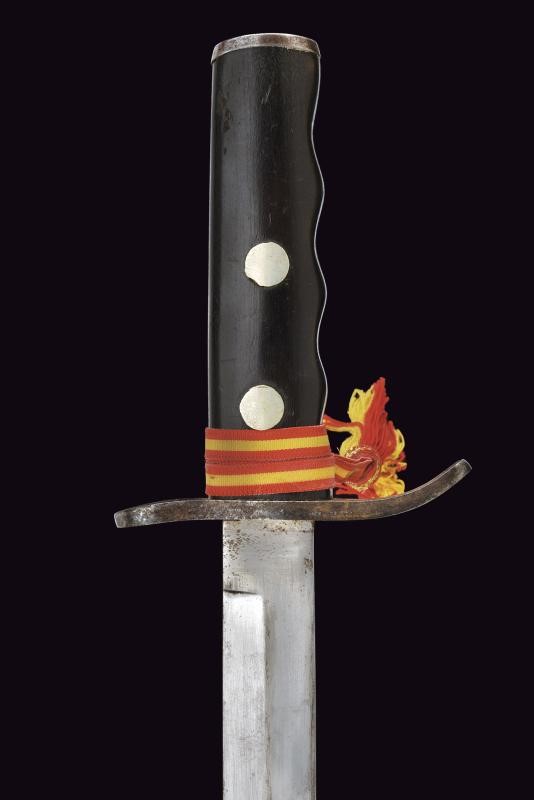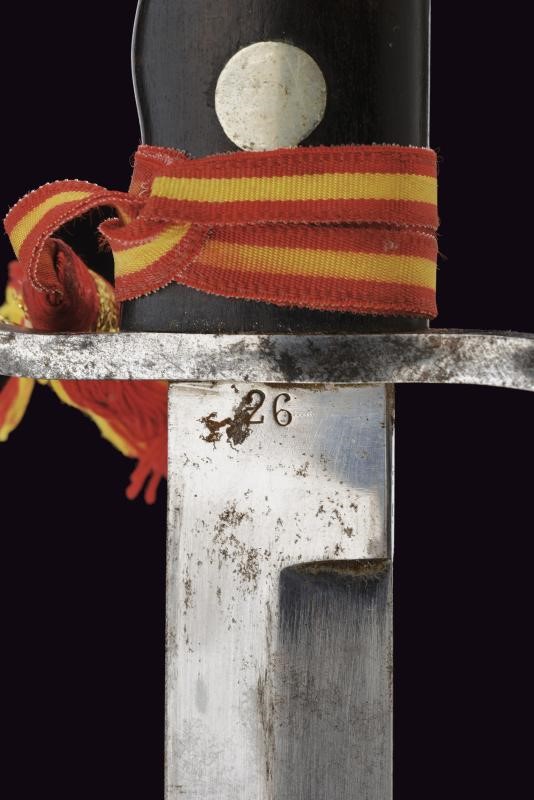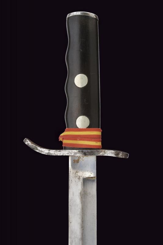 Robusta lama dritta a un filo con controfilo, con tallone numerato “26”. Impugnatura anatomica con guancette nere e fornimenti in ferro. Fodero in ferro dipinto di nero, con cappa rinforzata e passante obliquo. Dragona non pertinente. Probabile esemplare da sottufficiale nelle Legioni delle Camicie Nere.