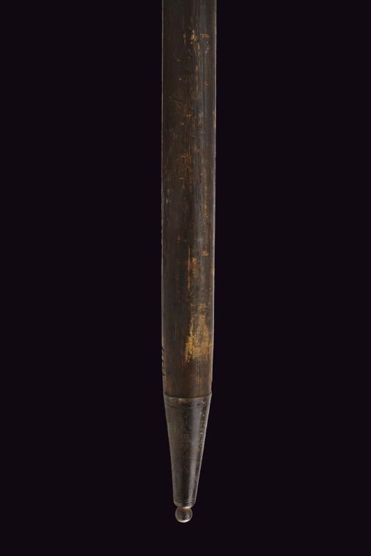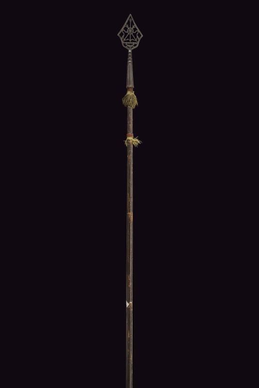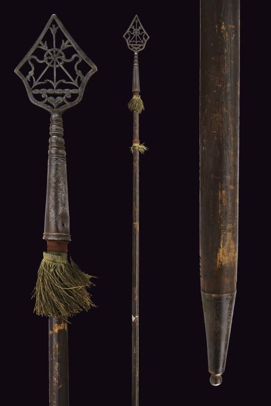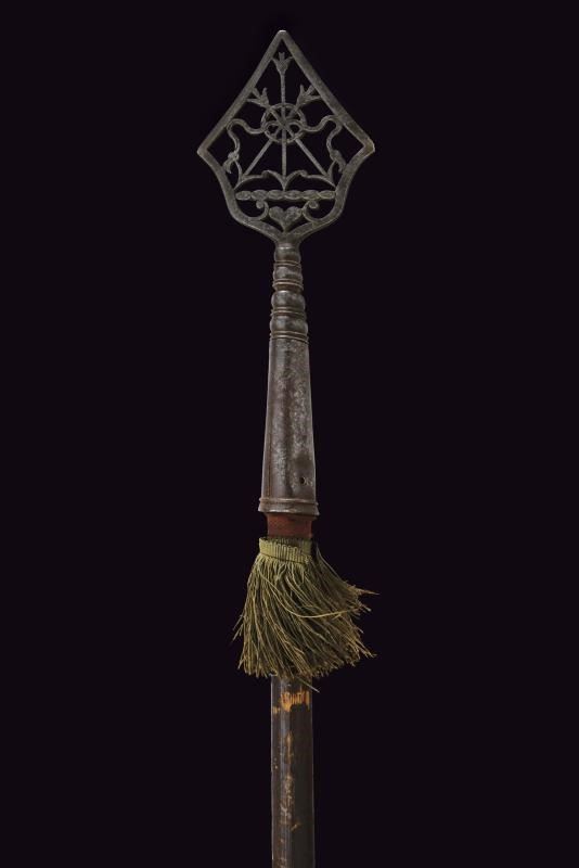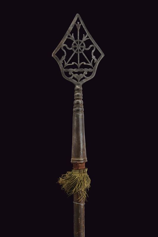 Cuspide in ferro riccamente traforata. La parte superiore triangolare e a due fili, il bordo inferiore con gobba tondeggiante. L'interno recante effige di una ruota, tre frecce, corda intrecciata e un cuore. Gorbia troncoconica decorata ad anellature. Fusto antico in legno con resti di nappe e rivestimento nella parte sottostante la gorbia. Piede in ferro.