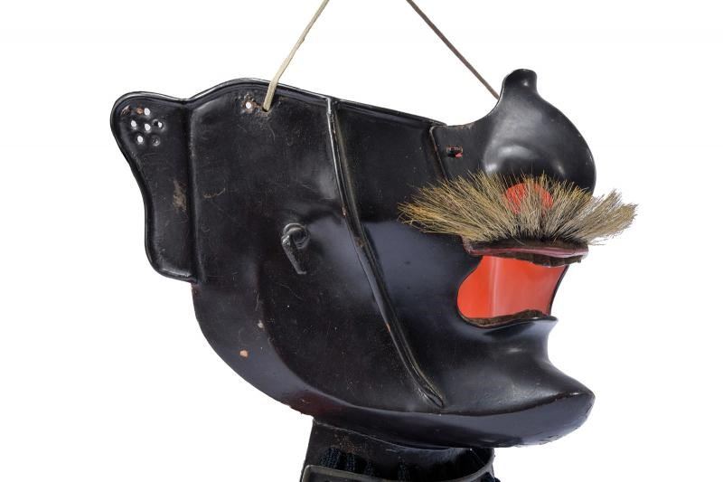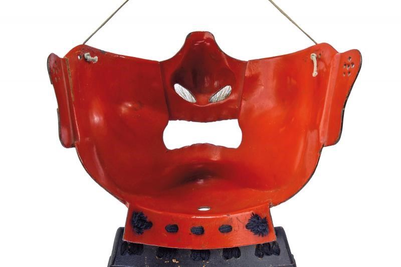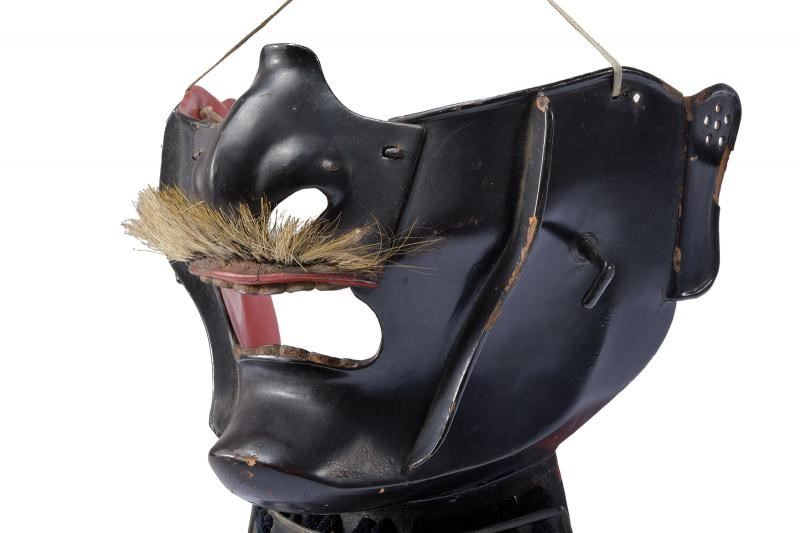 Del tipo Me-no-shita-men, con struttura in ferro e. La superficie esterna in lacca nera opaca (minime mancanze alla finitura). Espressione nobile. Completo del suo naso rimovibile. La bocca con mustacchi in crine di cinghiale antico (mancanze) labbra laccate rosse e con tracce di finitura dorata ai denti. Odayori-no-ita e Orikugi sulle guance. Le orecchie con sei sforature circolari disposte a rosetta. Asenagashi-no-ana sotto al mento. Interno in lacca rossa. Yodarekake a cinque lame in ferro, sempre con finitura nera e con tracce di doratura al bordo, Itamono-kozane (piastre non tagliate). Il retro in lacca nera (lievi mancanze alla finitura). Allacciatura bruna in stile Sugake.
