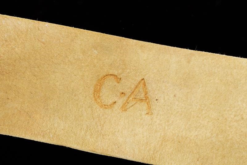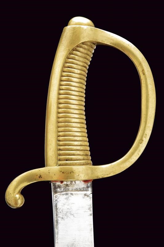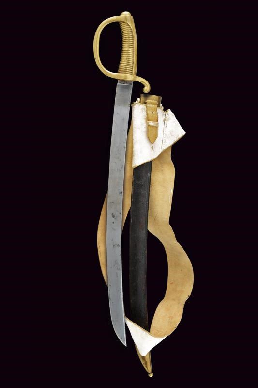Robusta lama curva a un filo con tallone. Fornimento in ottone massiccio con ramo di guardia e impugnatura a spire. Preda bellica: le originarie marcature francesi sono state asportate. Fodero in cuoio con fornimenti in ottone. Completa di tracolla in cuoio bianco marcata “C.A.” Usata anche dalla gendarmeria, ma abbinata a una baionetta.
