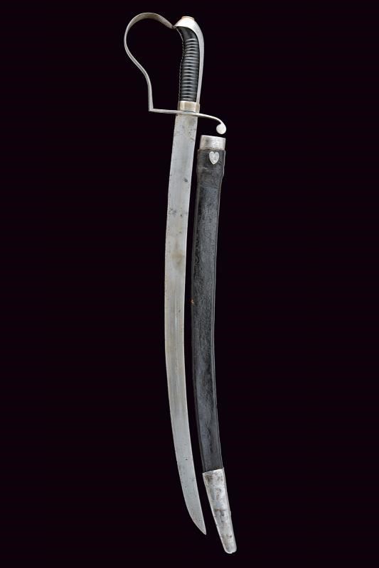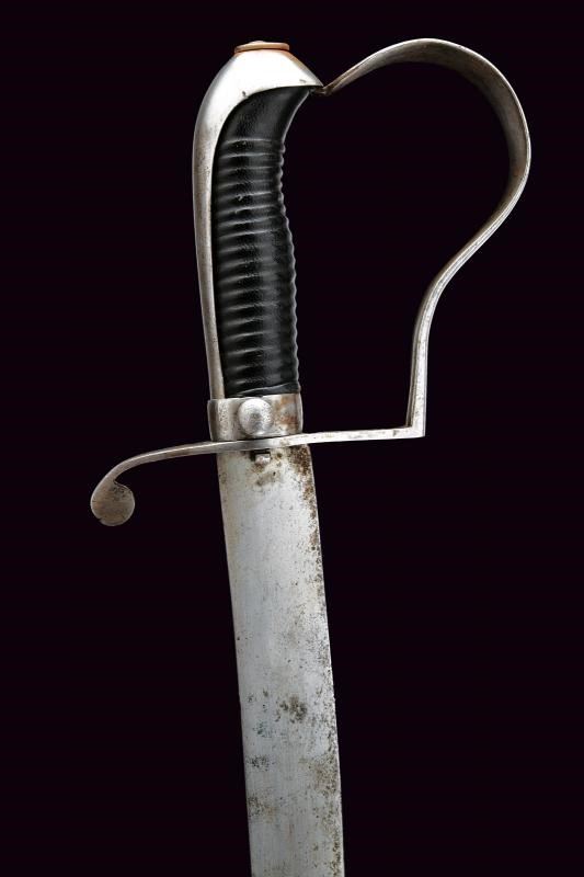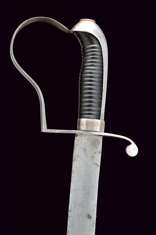Lama piatta, curva, a un filo. Fornimento in ferro con un ramo di guardia e lunga cappetta liscia. Impugnatura in legno rivestita di cuoio; ghiera con chiusura a molla. Fodero in cuoio con fornimenti in ferro e bottone a cuore.