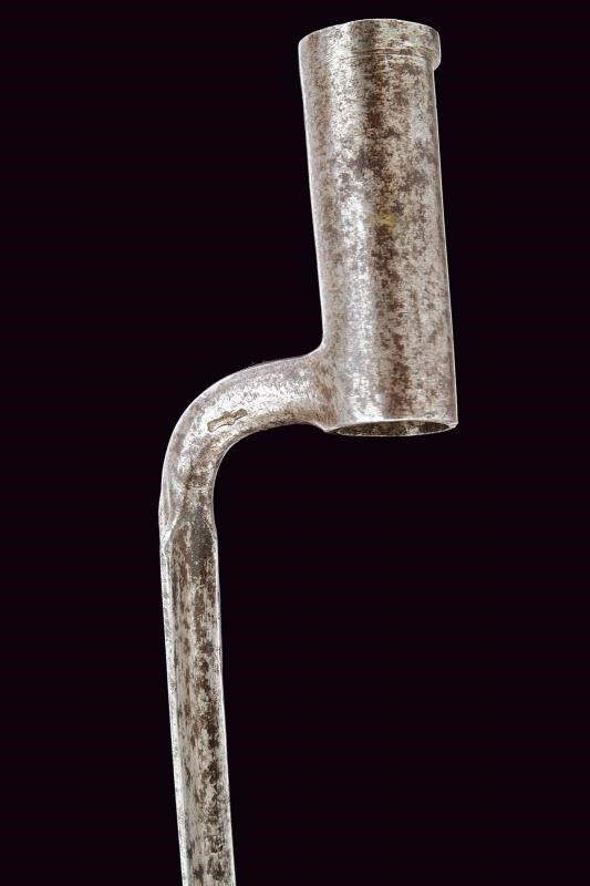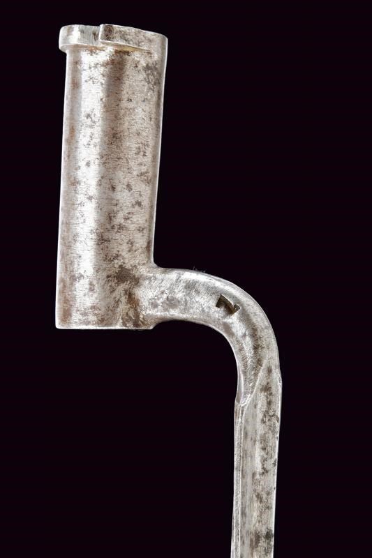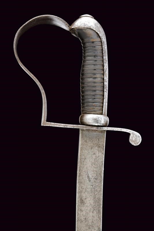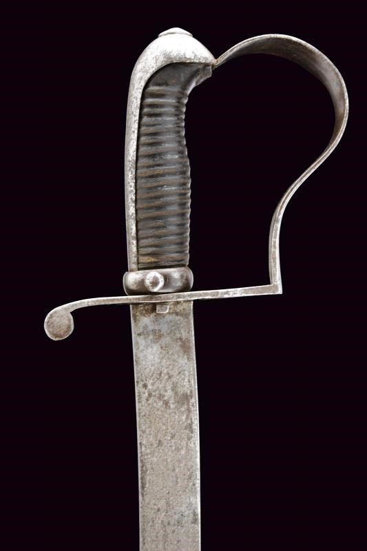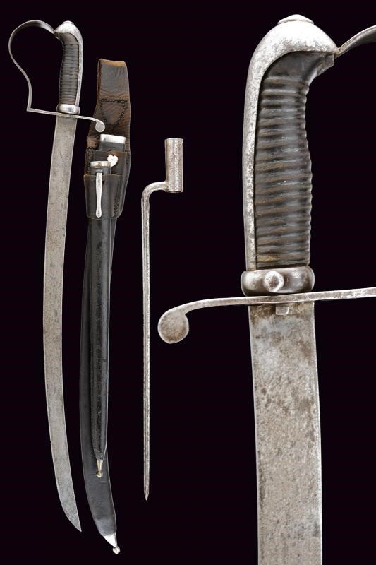 Sciabola con lama piatta, curva, a un filo. Fornimento in ferro con cappetta lunga liscia. Impugnatura in legno rivestita di cuoio, priva di trecciola. Fodero in cuoio con fornimenti e bottone a cuore in ferro. Baionetta a ghiera con lama a sezione cruciforme, collo marcato “Z”, completa di fodero in cuoio con fornimenti e gancio in ferro. Entrambi i foderi riuniti in una taschetta in cuoio.
