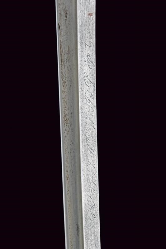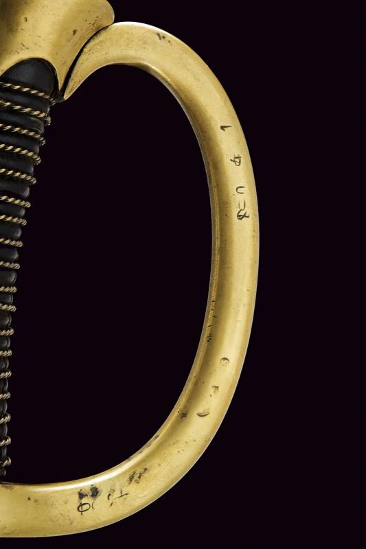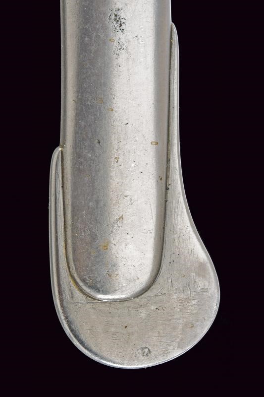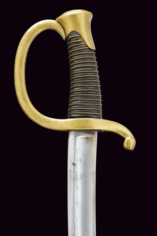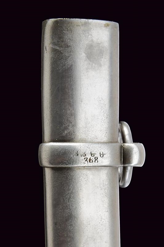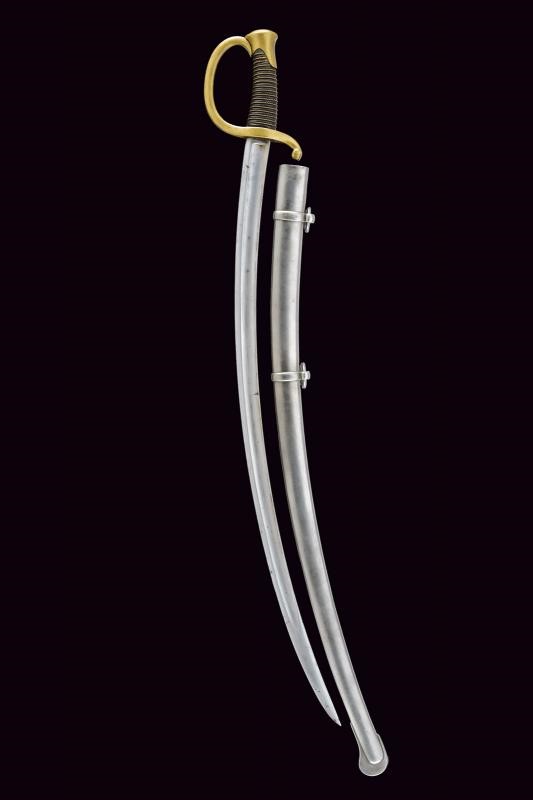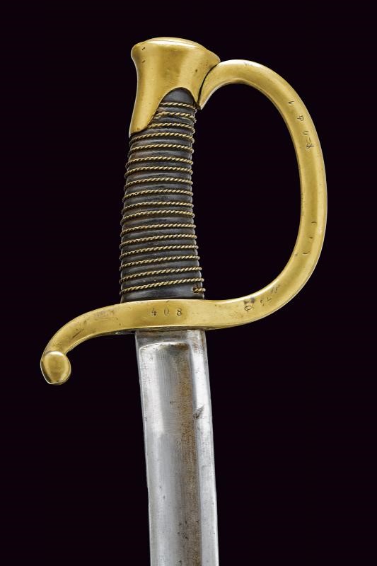 Lama curva sgusciata, con resti di marcatura di Chatelleralut al dorso e resti di data "183..." (l'iscrizione non più chiaramente leggibile). Fornimento monoelso in ottone, con numerazione e resti di punzoni. Cappetta corta. Impugnatura con rivestimento in manica di cuoio (antica?) e con avvolgimento di trecciola in ottone. Fodero in ferro (imboccatura mancante), a due campanelle, con resti di numerazione su una fascetta.
