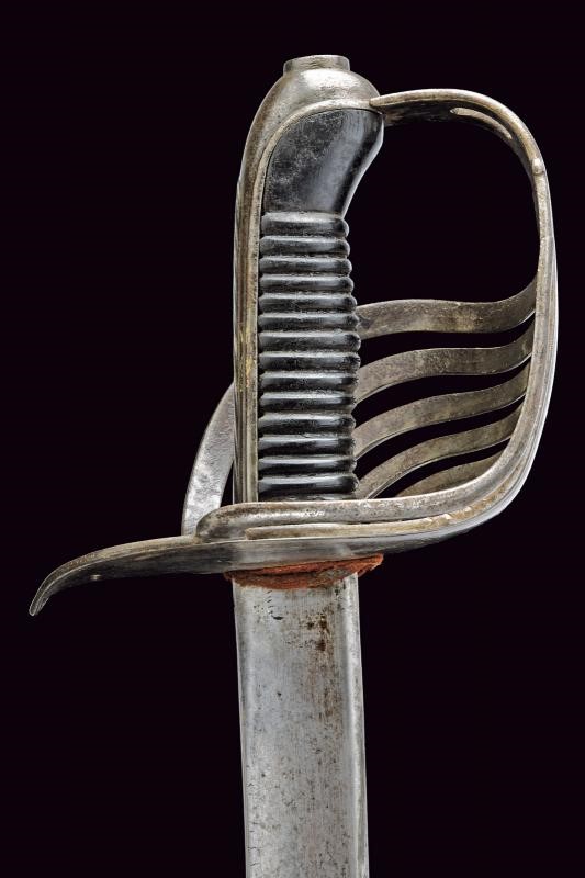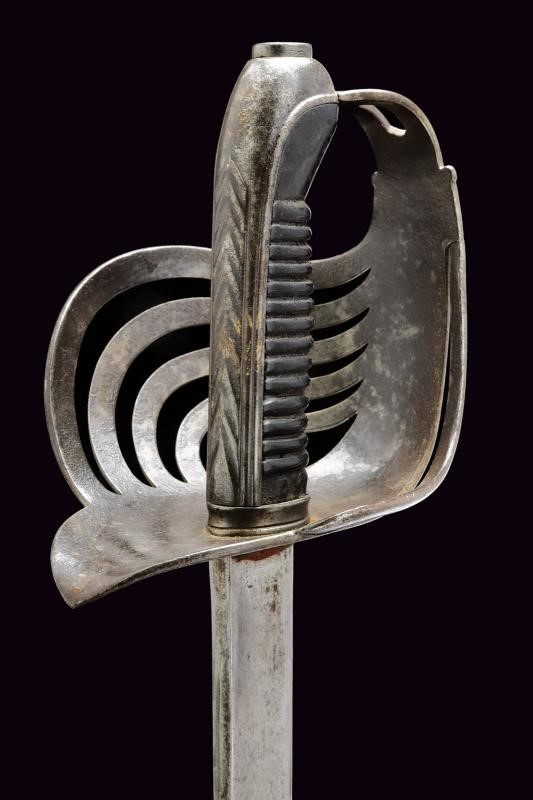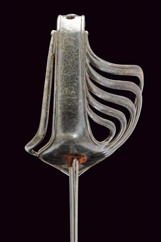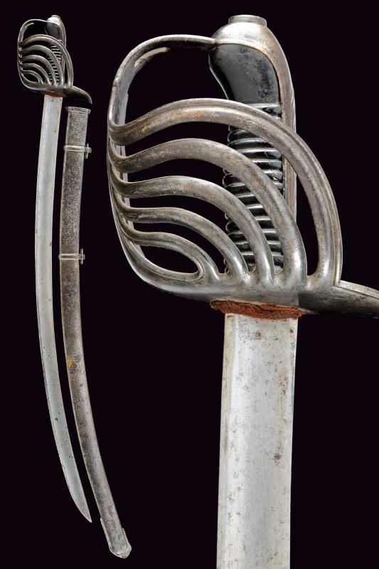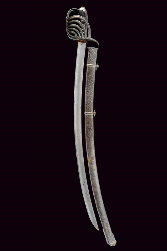 Lama curva a un filo e controfilo, sgusciata per tutta la lunghezza su entrambe le facce. Fornimento in ferro a sei rami di guardia e uno di controguardia. Cappetta lunga con dorso decorato a "V" rovesce sgusciate. Impugnatura a bande bombate trasversali. Completa del suo fodero originale in ferro a due campanelle.