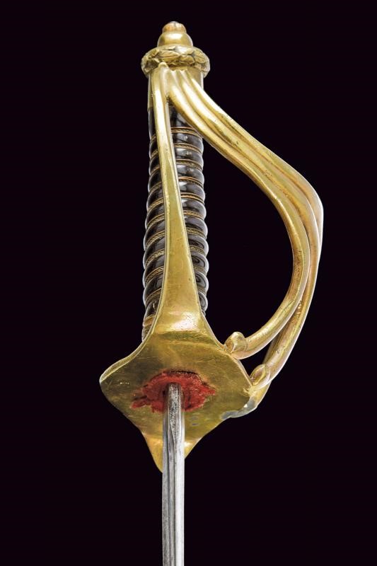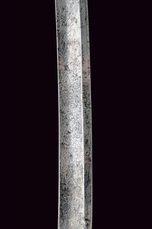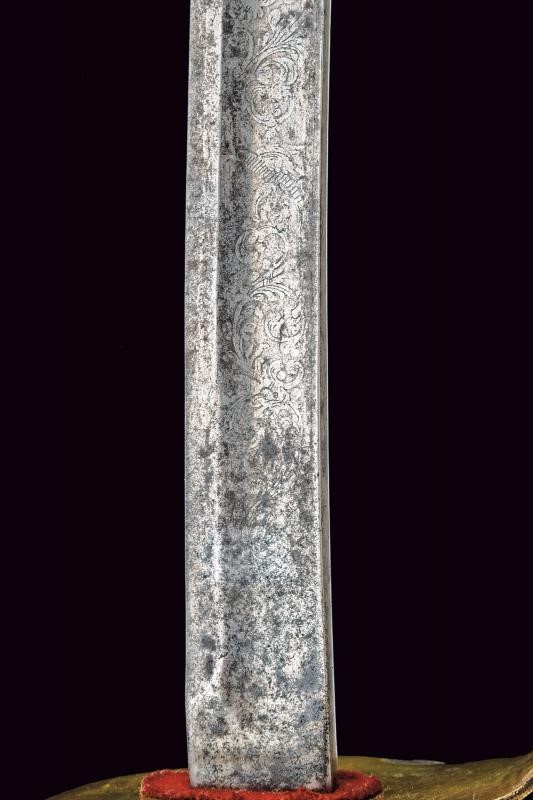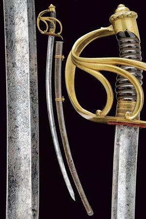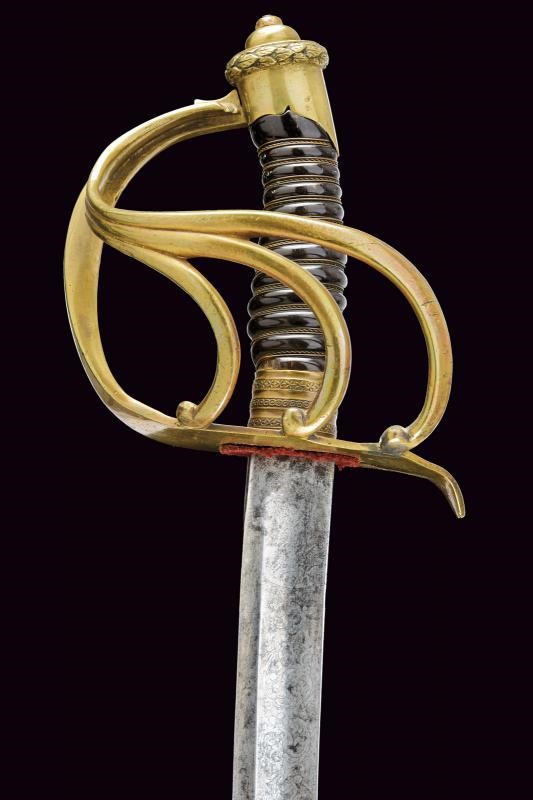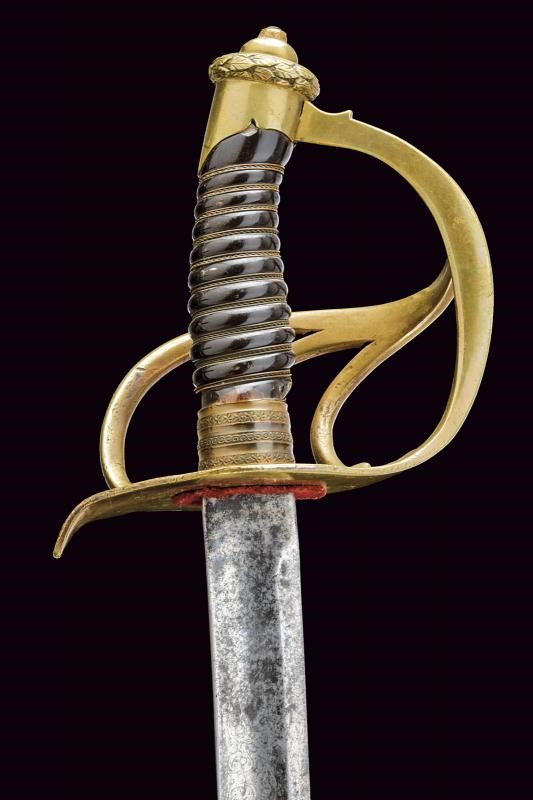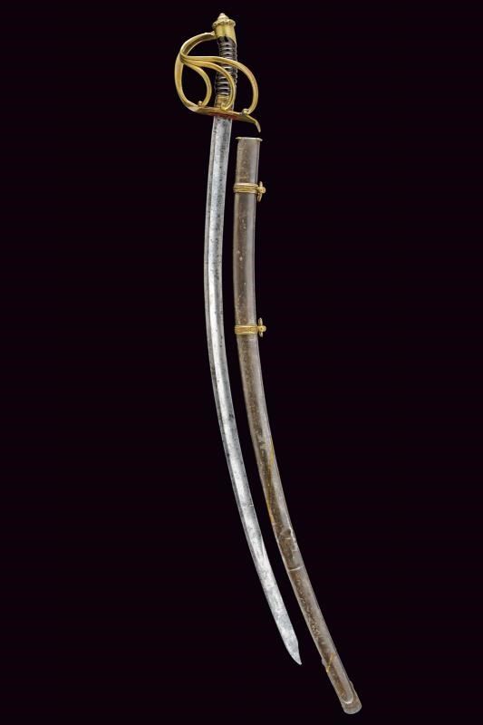 Lama curva a filo, punta e controfilo, recante nella prima parte resti della firma "Napoli 1848 Labruna" ed incisa a motivi floreali e trofei. Fornimento in ottone con quattro rami di guardia, cappa corta con decoro a rilievo a motivi floreali, alta ghiera a tre fasce intagliate a fiorami. Impugnatura in corno con trecciola metallica. Fodero in ferro con fascette in ottone intagliate a fiorami e munite di anelli di sospensione, sempre in ottone. Molto rara.