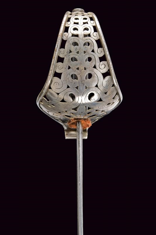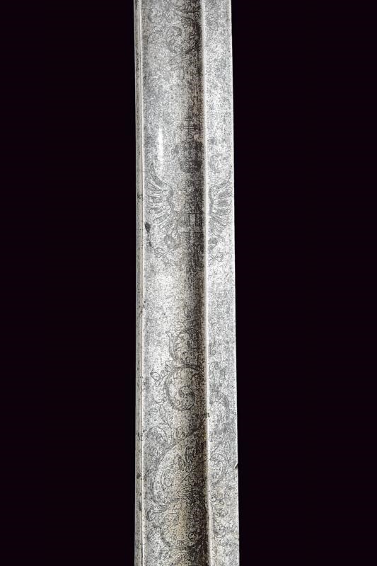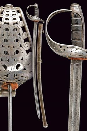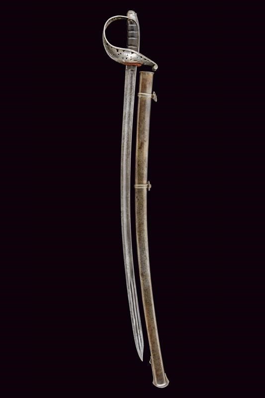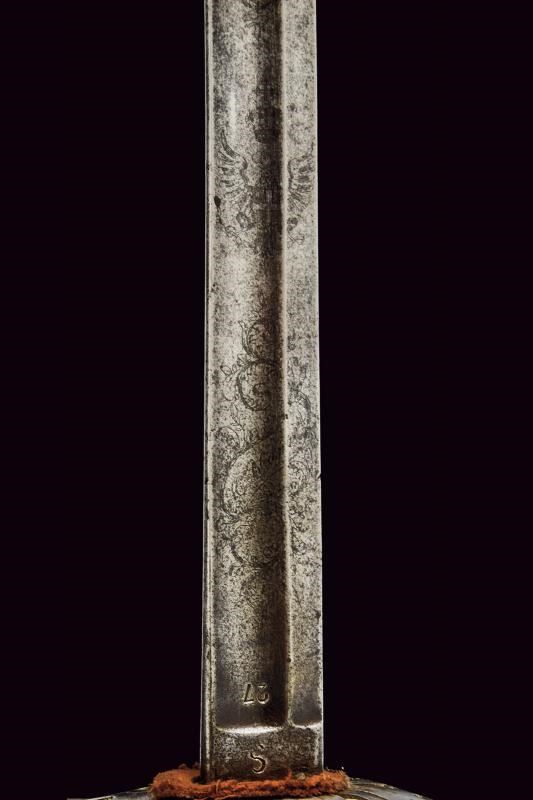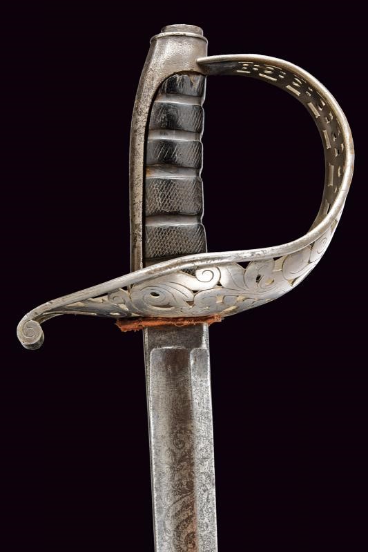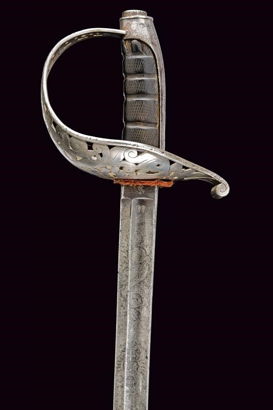 Lama leggermente curva a un filo e controfilo con sguscio centrale che si sdoppia al debole, incisa al forte a trofei, con aquila sabauda coronata e disegni floreali, la base numerata "27" e il tallone marcato "S". Fornimento in ferro con vela messa a giorno e decorata a motivi floreali e con giglio stilizzato. Cappetta lunga, impugnatura in ebano lavorata a settori zigrinati (alcune mancanze). Fodero in ferro a due anelli di sospensione.
