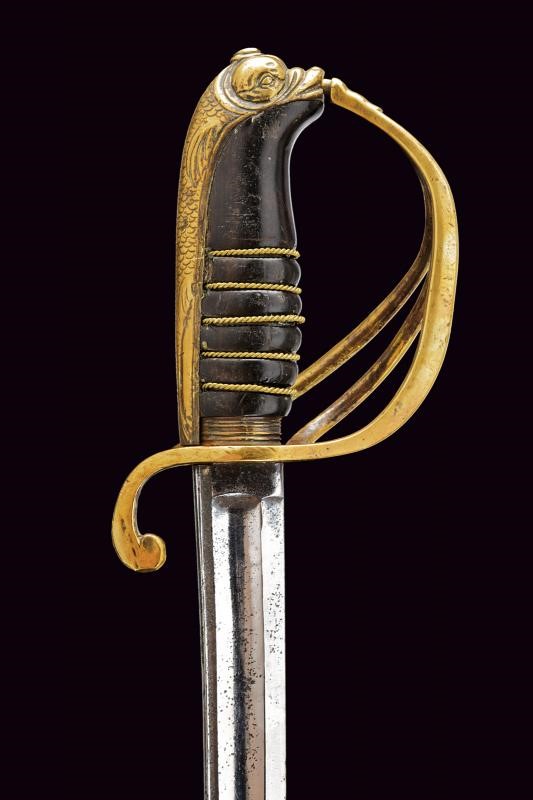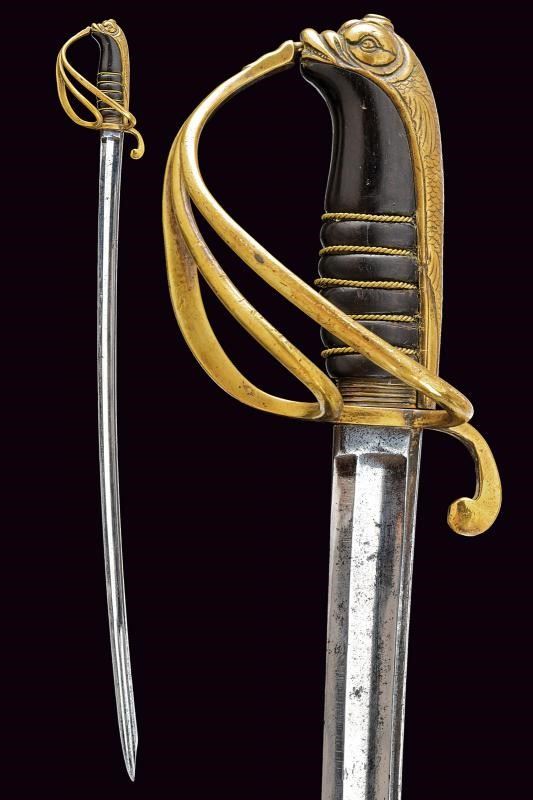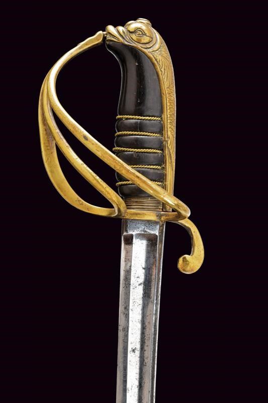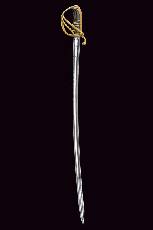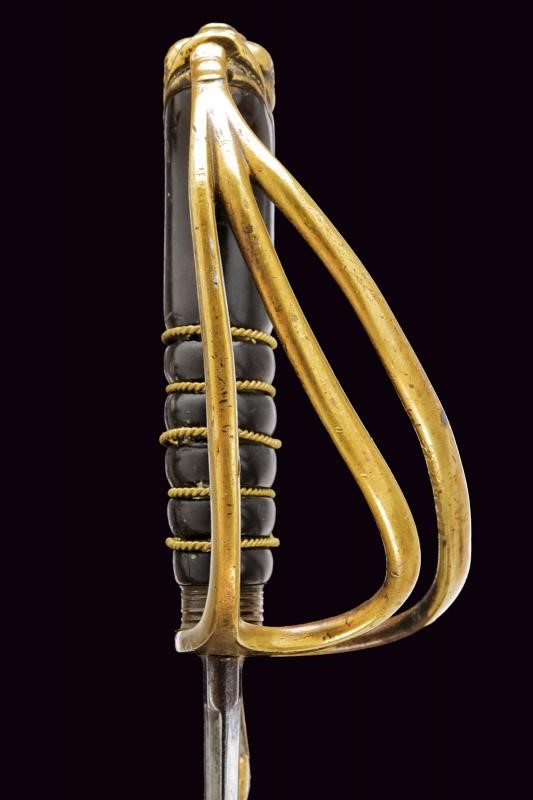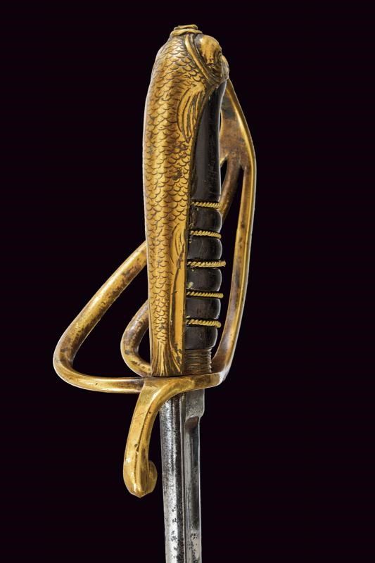 Lama curva con filo e controfilo con sguscio centrale che si sdoppia al debole e con scanalatura dorsale. Fornimento in ottone con guardia a tre rami, braccio di parata a ricciolo; cappetta lunga a testa di mostro marino le cui squame si estendono fino all'estremità inferiore del dorso; impugnatura in corno nero con trecciola in filo d'ottone; priva di fodero. Rara.