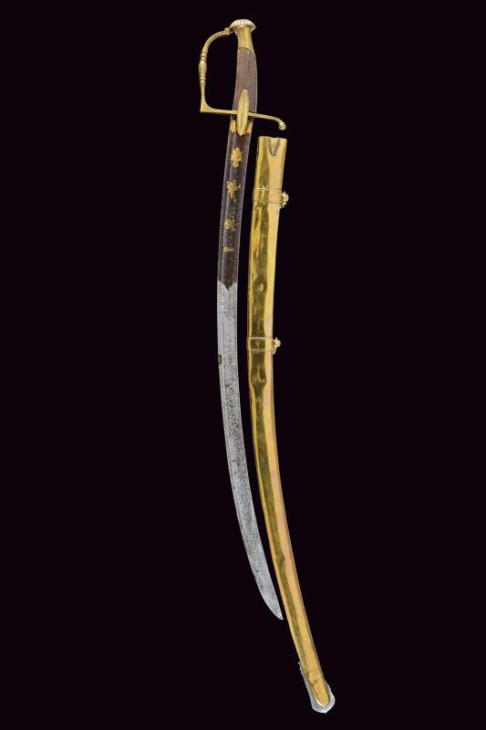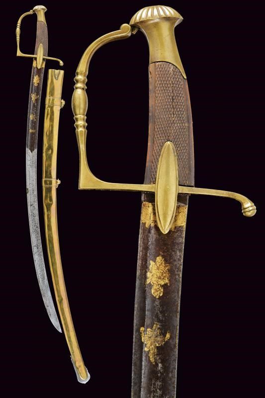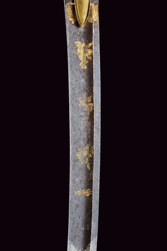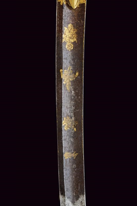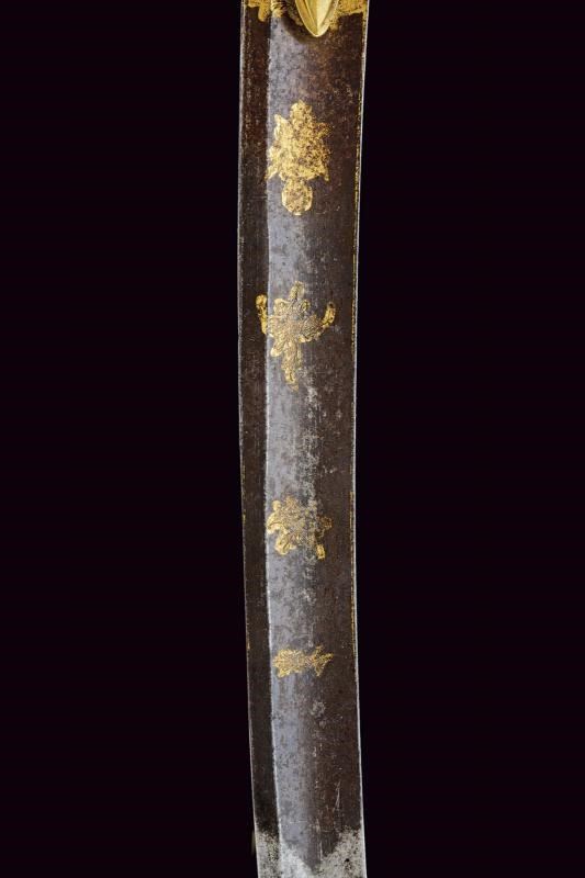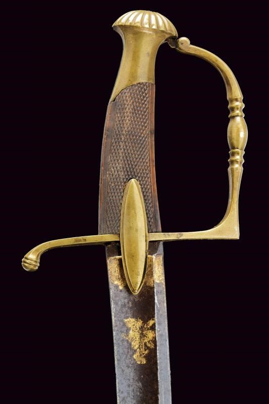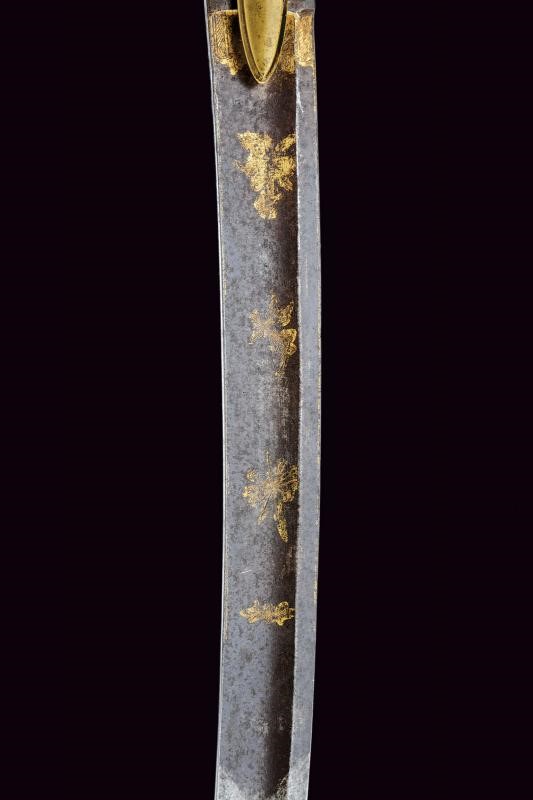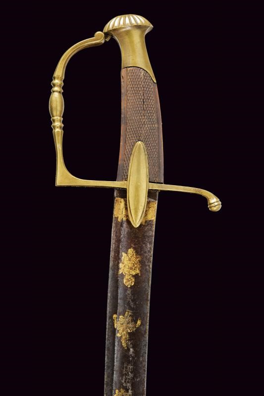 Lama di media larghezza, curva, a un filo e controfilo, con ampio sguscio centrale incisa e dorata nella parte iniziale (con mancanze alla finitura) su fondo blu a trofei e motivi floreali. Fornimento in ottone con alette fermafodero e pomo scanalato. Impugnatura in legno zigrinato. Fodero in ottone a due anelli di sospensione.
