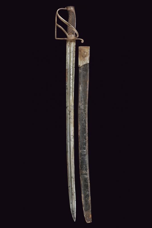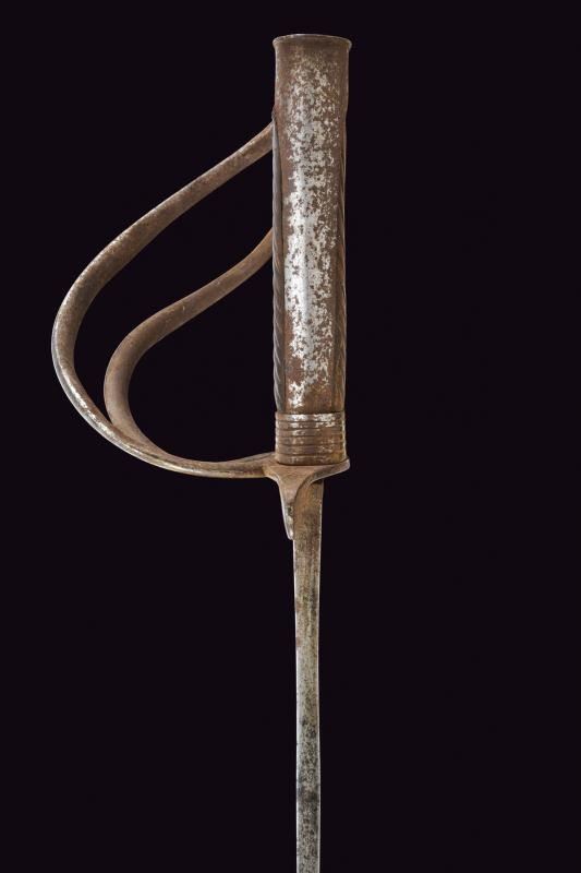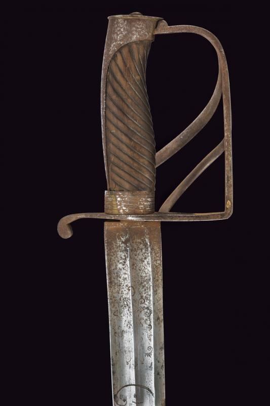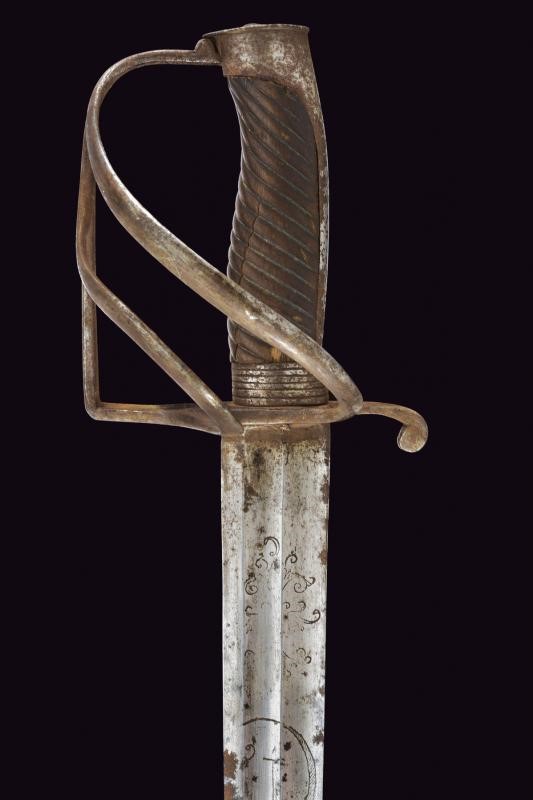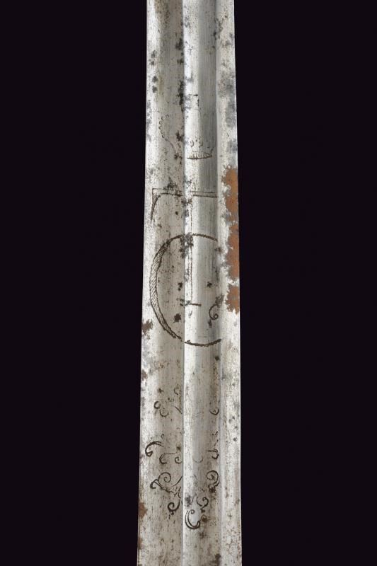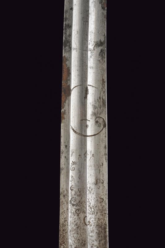 Larga lama leggermente curva a un filo e controfilo, doppiamente sgusciata; dopo circa un terzo della lunghezza lo sguscio dorsale divide in due ramificazioni una sola delle quali arriva fino al debole; la base con lievi resti di incisioni, delle quali si possono ancora leggere le cifre "TC" coronate (per Karl Theodore, elettore di Baviera) e un disegno che potrebbe ricordare o un motivo floreale speculare con una "C" in basso. Fornimento in ferro con guardia a staffa e due rami, braccio di parata a ricciolo. Pomo angolato con cappetta lunga. Impugnatura in legno scolpito a bande oblique (crepa e piccole mancanze). Ghiera in ferro con con cinque anelli scanalati. Gli elementi in ferro con ruggine. Fodero in cuoio (difetti) con cappa in ferro munita di bottone a cuore; manca il puntale. Rara.
