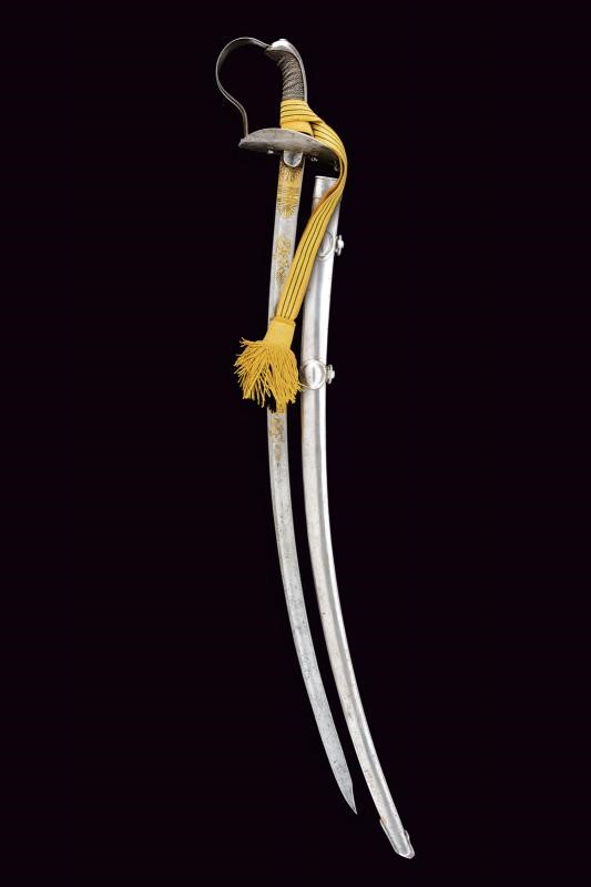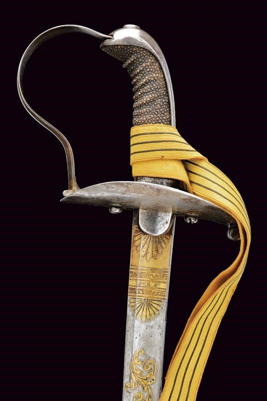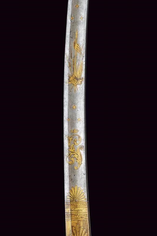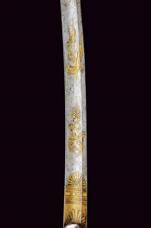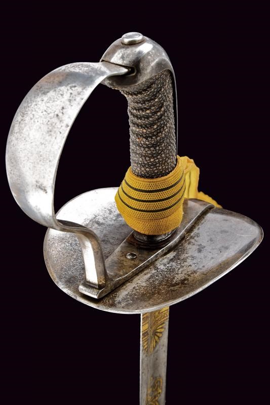 Lama curva a un filo con controfilo e ampio sguscio per quasi tutta la lunghezza, in damasco. La prima metà incisa e dorata a trofei e motivi floreali; alla base la firma “P. Küll Solingen”. Fornimento in ferro con grande coccia, largo ramo di guardia e lunga cappetta faccettata. Impugnatura in legno rivestita con pelle di pesce. Completa di dragona. Fodero in ferro con due anelli di sospensione su fascette bombate.
