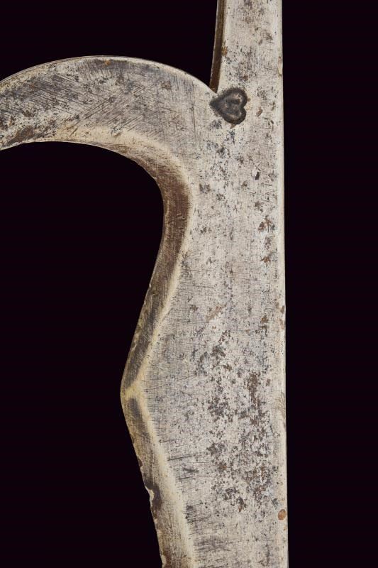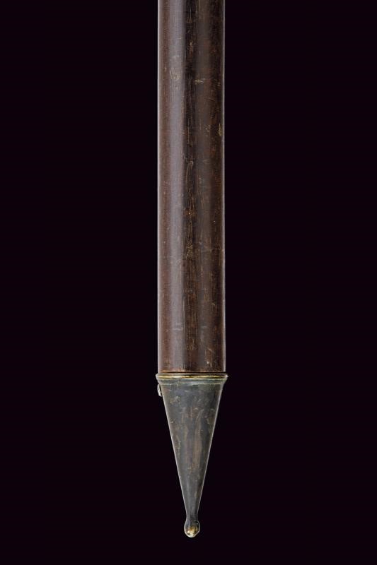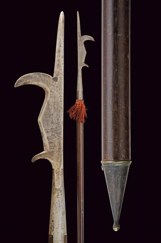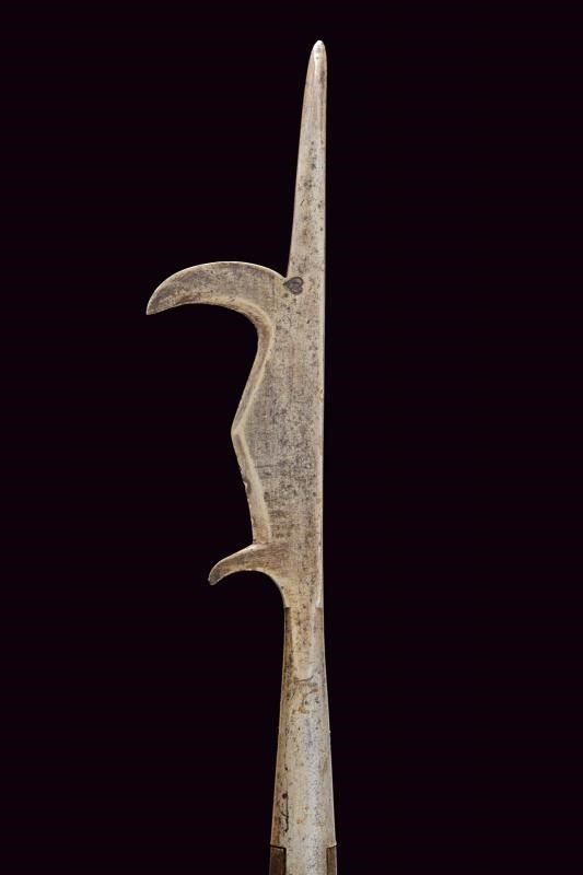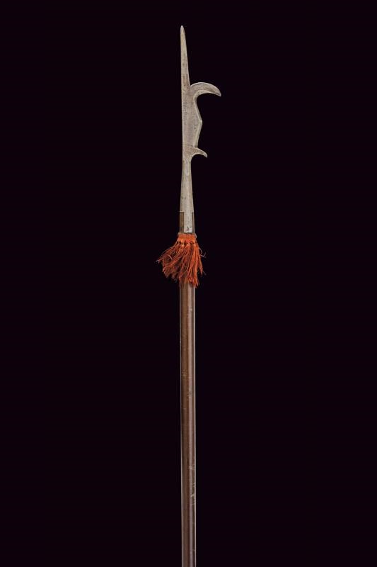 Con ferro da roncone, ma di piccole dimensioni, dotato di cuspide sommitale dritta, piccola ronca a taglio incavato, filo cuspidato al centro e arresto singolo alla base. Sulla superficie un punzone a cuore caricato con lettera "M". Brevi bandelle parallele congruenti. Su asta lignea probabilmente più tarda, dotata di piede metallico e nappa in tessuto rosso. Tipica insegna di rango per ufficiali e sottufficiali della prima epoca moderna. Non comune con ferro da roncone.