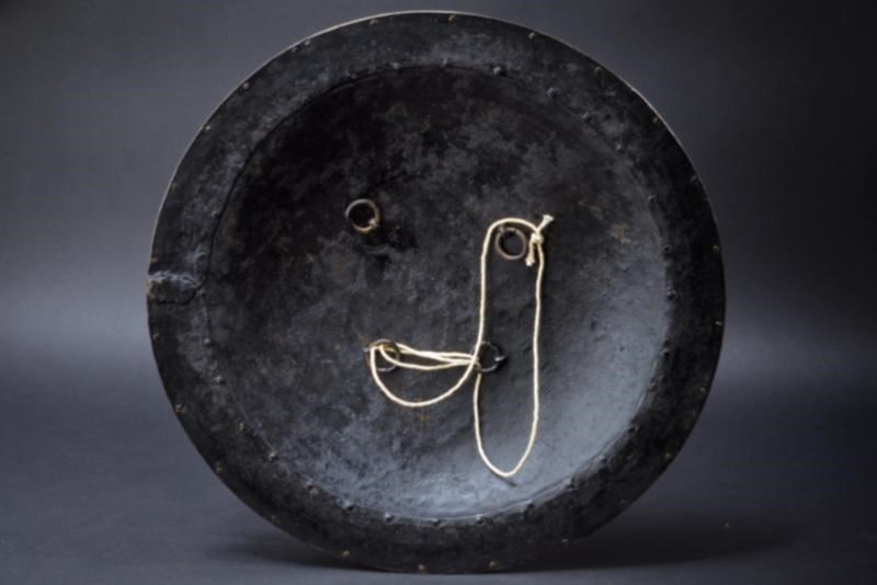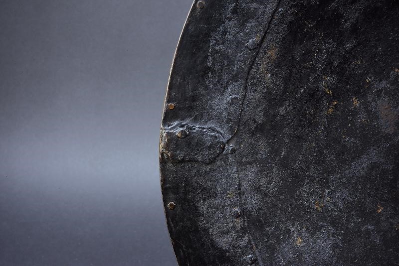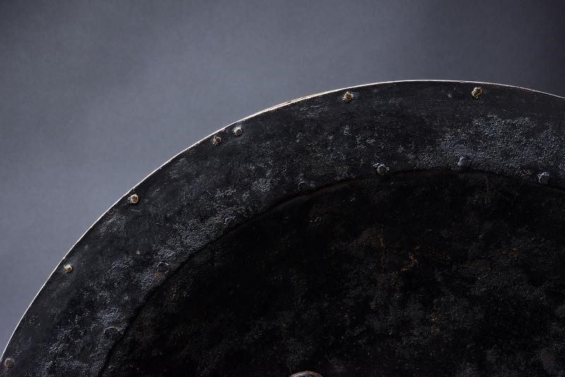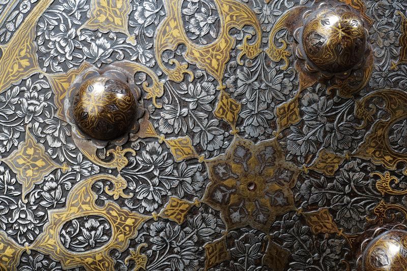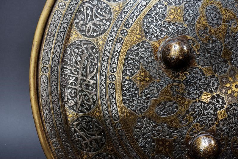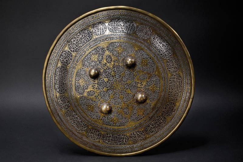 In ferro, di forma circolare e convessa, munito di quattro borchie a forma di fiore e dotato di bordo rinforzato con una banda in ottone fissata con ribattini. L'intera superficie è finemente incisa a motivi floreali su fondo scuro e parzialmente dorata. Il margine presenta cartigli grandi alternati ad altri più piccoli, recanti versi del Corano con resti di decorazione in argento; tale fascia è incorniciata da due bande ornate da motivi floreali. Il bordo è internamente rinforzato da una fascia larga circa 4,2 cm. All'interno sono presenti quattro anelli per le maniglie (mancanti).