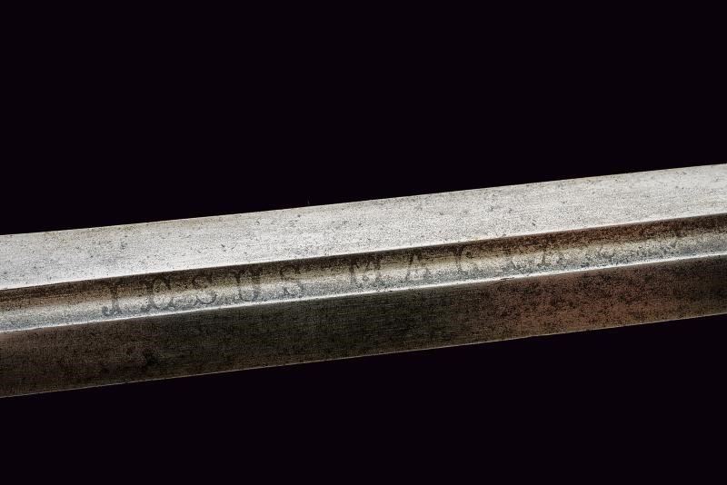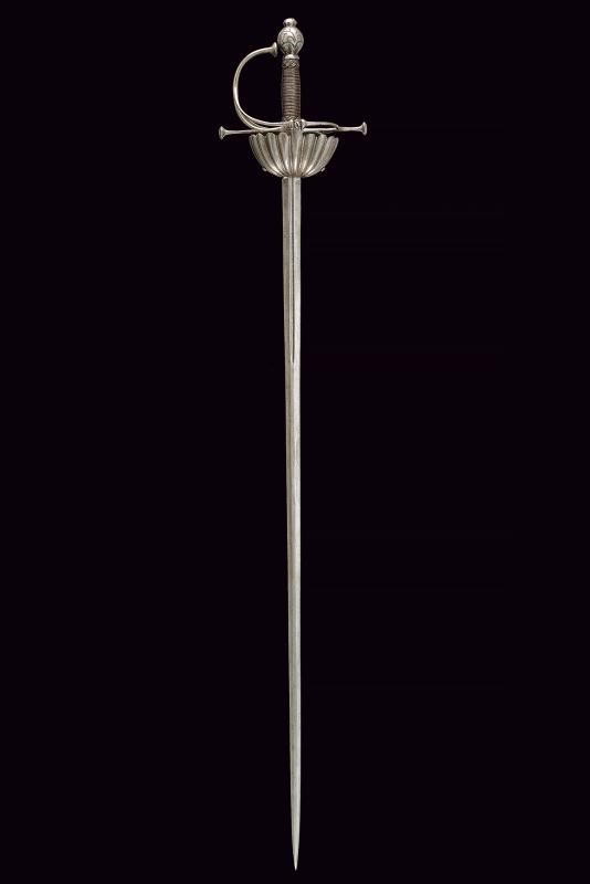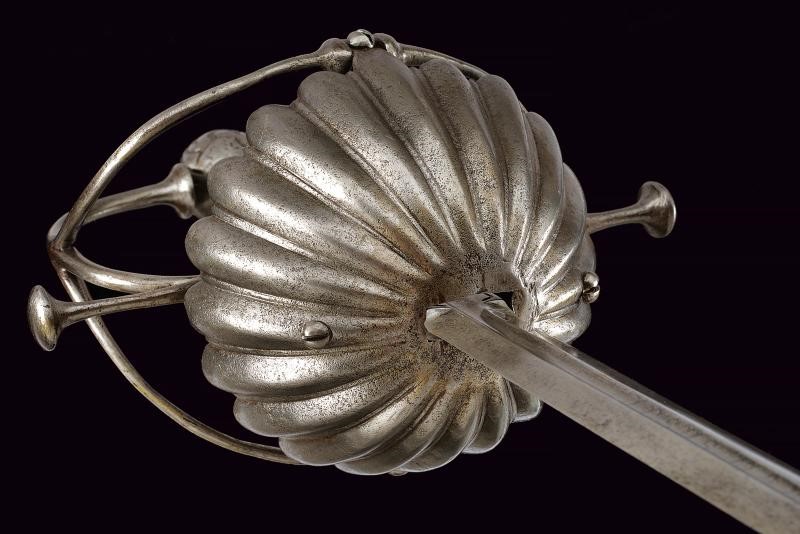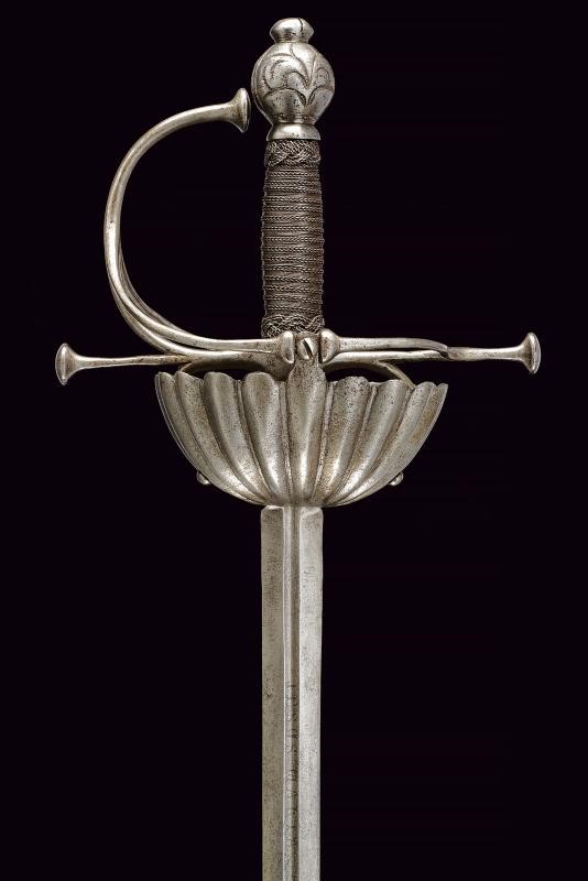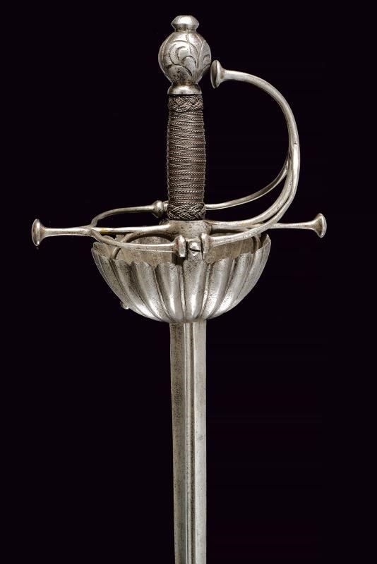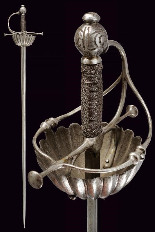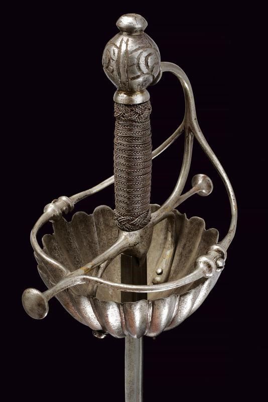 Lama dritta a due fili, con scanalatura centrale al forte, in seguito di sezione esagonale. Fornimento in ferro, coccia a tazza completamente lavorata a petali bombati; elso a bracci dritti con testa a trottola; pomo sferico intagliato con gigli; impugnatura rivestita con bella trecciola e dotata di teste di moro in filo di ferro, bottone a cuscino (crepa).
