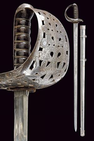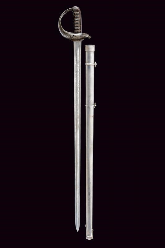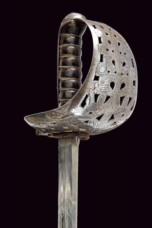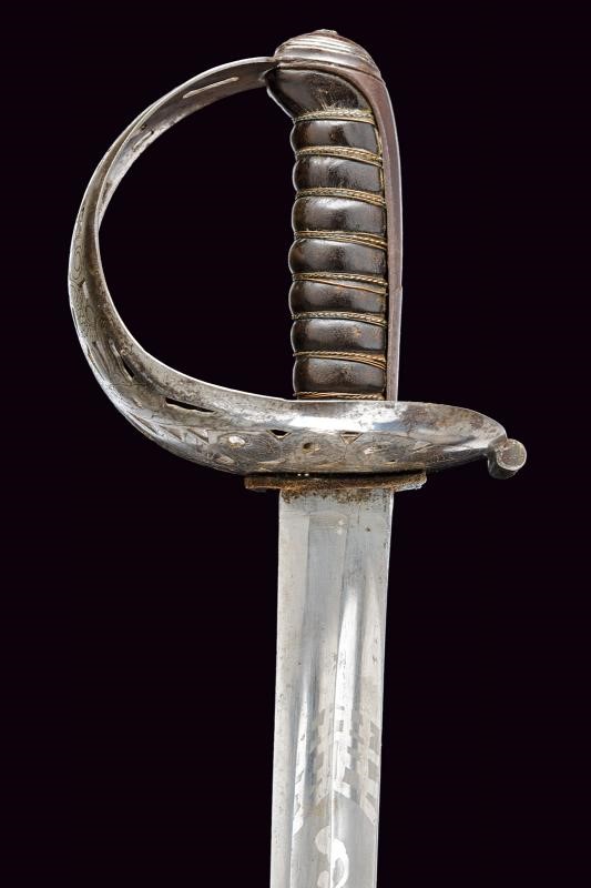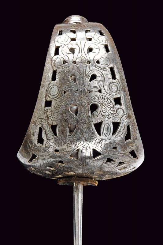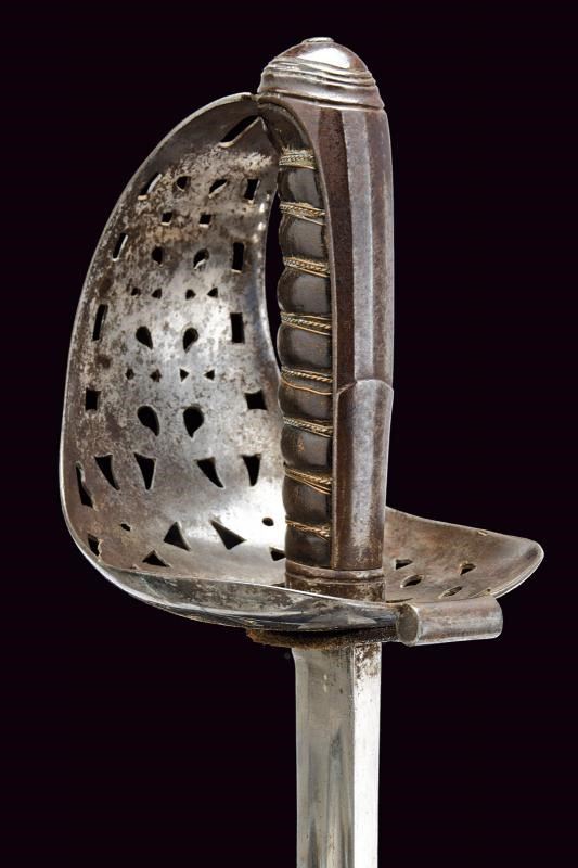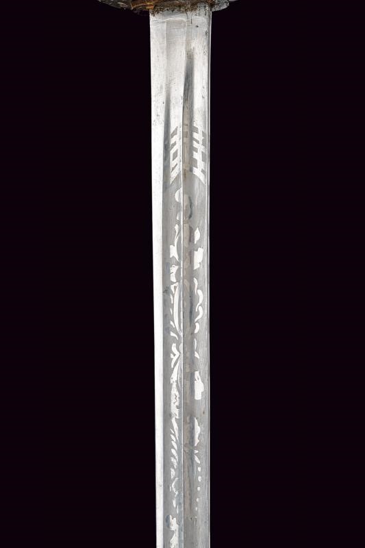 Larga lama diritta a un filo e controfilo, con duplice scanalatura per l'intera lunghezza e con tallone. Fornimento in ferro con ampia vela traforata e incisa, lunga cappetta e impugnatura in legno rivestita di cuoio e avvolta da trecciola metallica. Fodero in ferro con due anelli di sospensione.