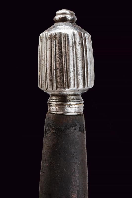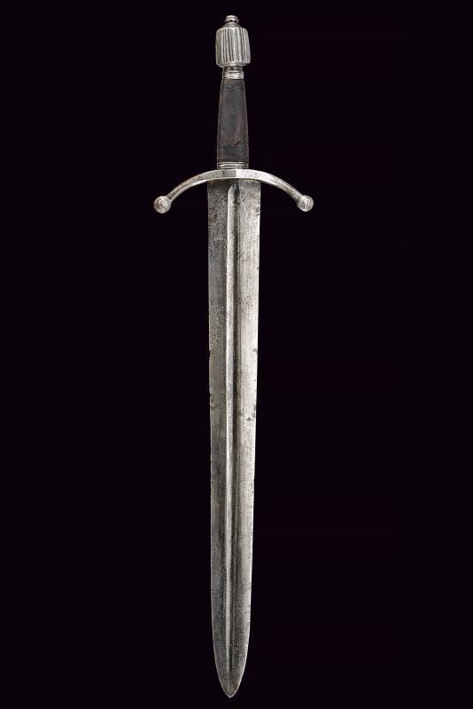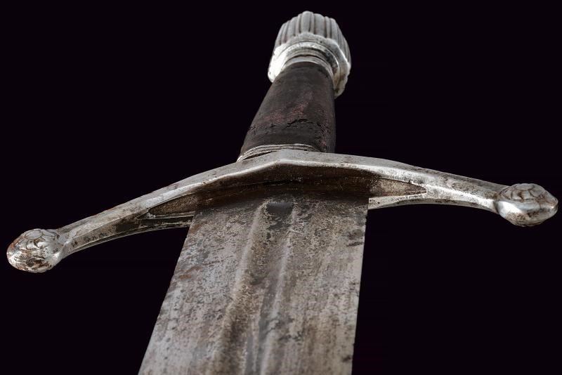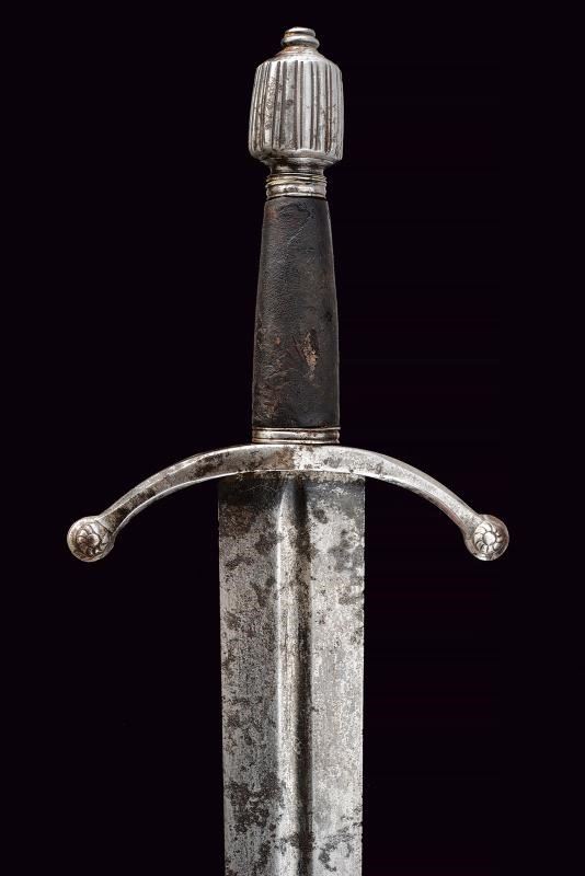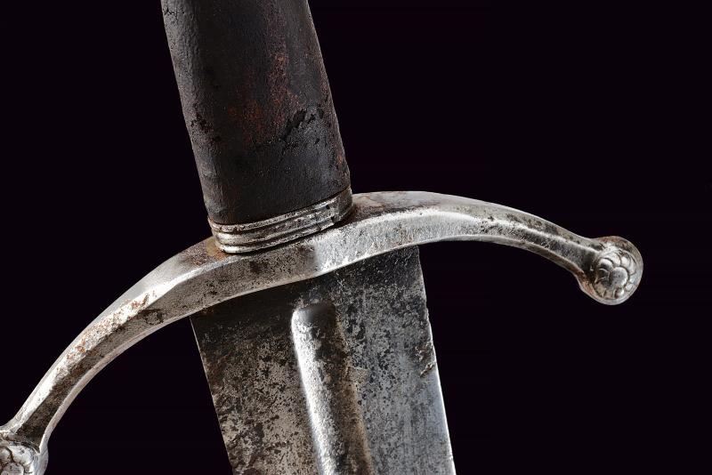 Lama dritta a due fili con profondo sguscio centrale, diverse intaccature sulla superficie . Elso con bracci incurvati verso il piano di lama, teste tonde con decoro a fiore, il colmo leggermente appuntito. Impugnatura rivestita in cuoio. Bel pomo del XVII secolo, a tino, con scanalature longitudinali; ghiere in ferro. Interessante.