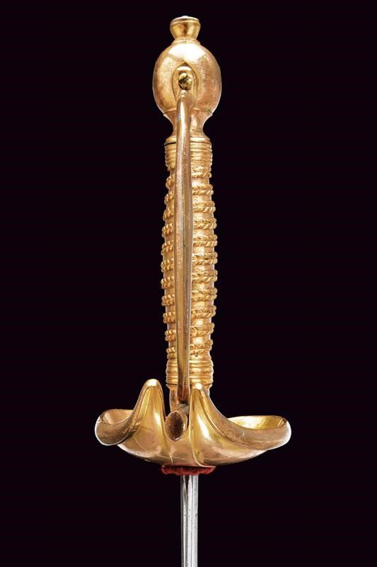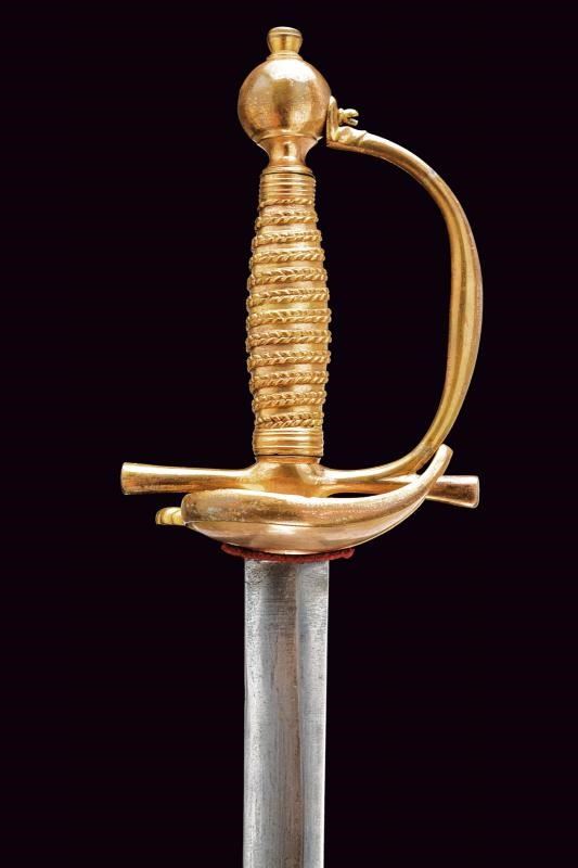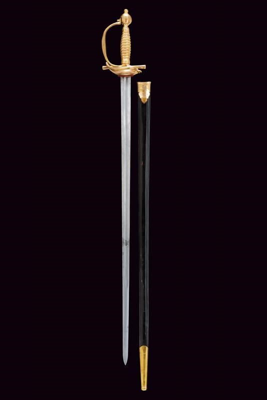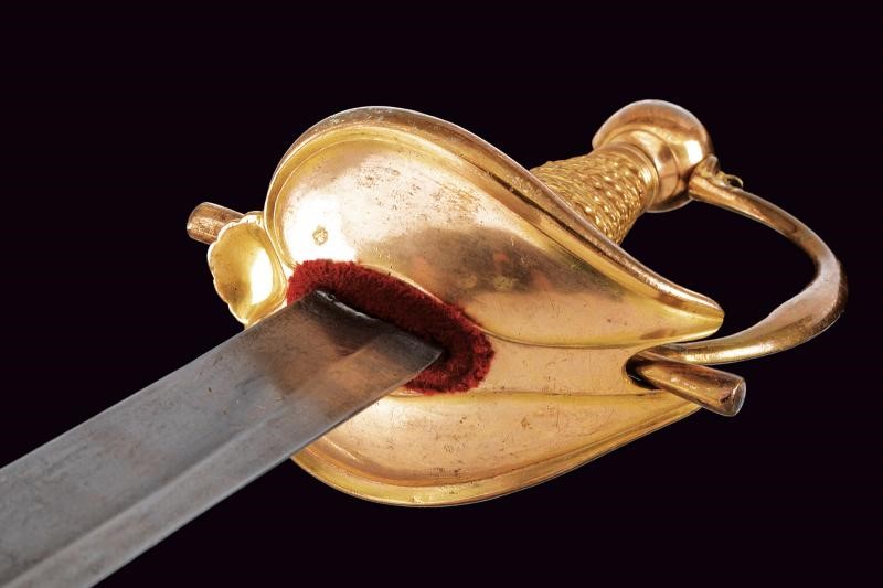 Lunga lama diritta a un filo con controfilo, con ampio sguscio nella prima parte e, a seguire, di sezione lenticolare. Fornimento in bronzo massiccio con resti della doratura originale. Fodero in cuoio con fornimenti in bronzo dorato; cappa con bottone a forma di cuore.