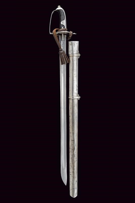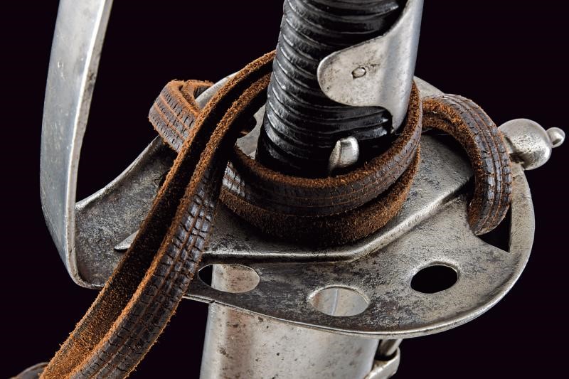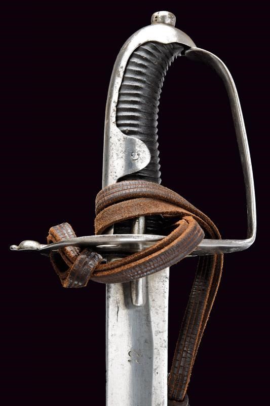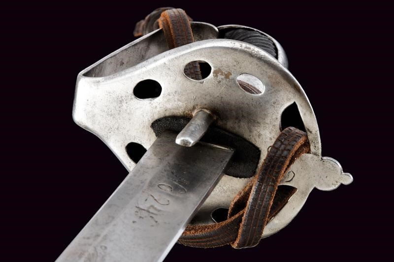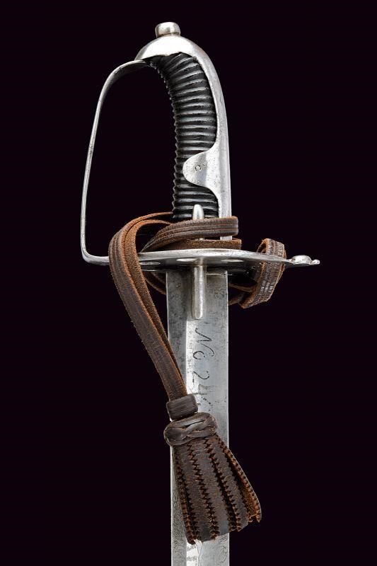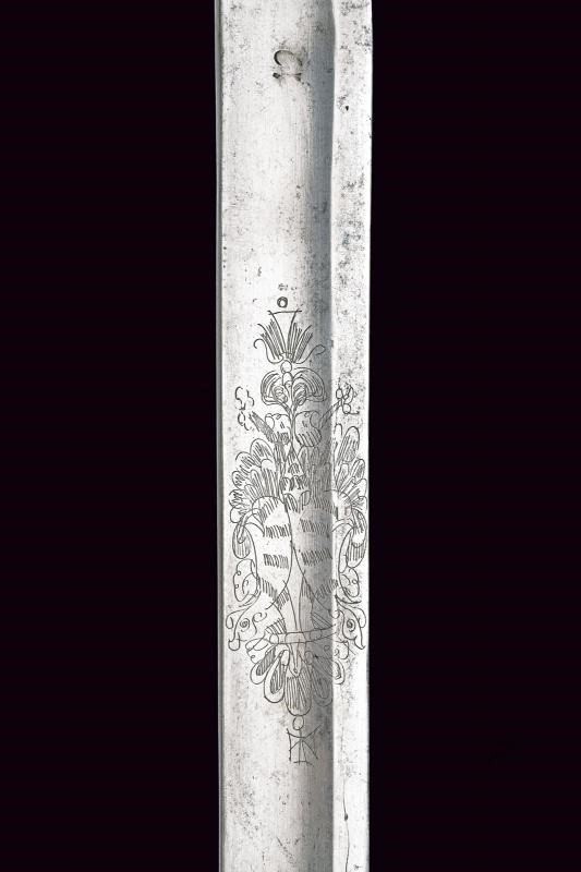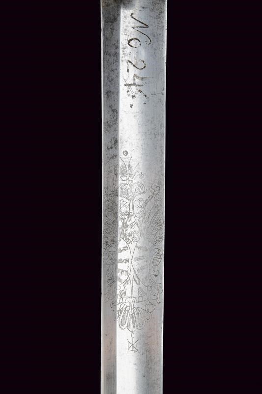 Lama diritta a un filo con controfilo e ampio sguscio, recante l'aquila bicipite coronata su entrambi i lati, marcata “No 24/5” al forte; al centro della lama tracce di un restauro. Fornimento in ferro con coccia traforata (marcata “0:2 / N. 59”) e ampio ramo di guardia. Cappetta lunga e liscia. Impugnatura a spire, priva di trecciola. Dragona in cuoio. Fodero in ferro a due campanelle. Esemplare raro.