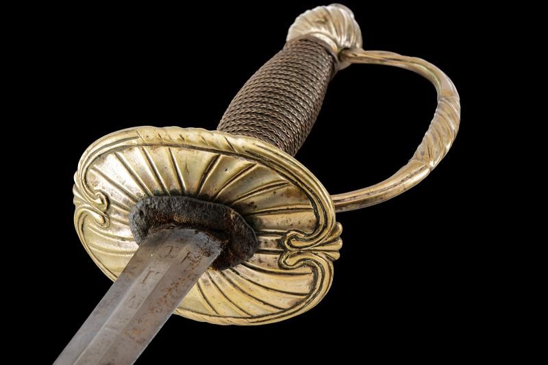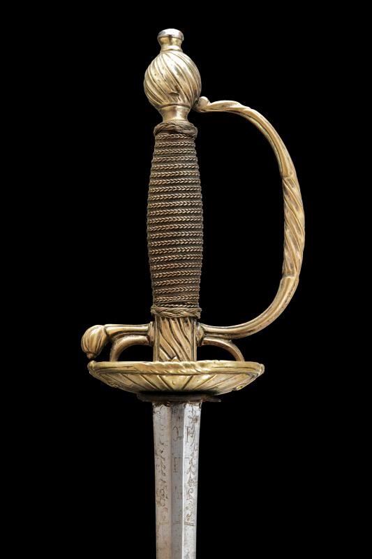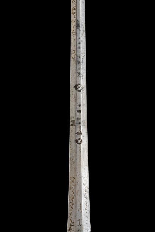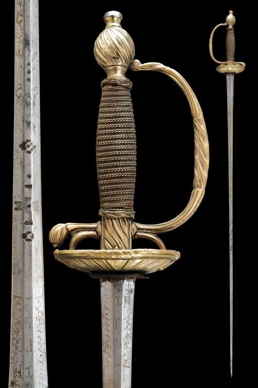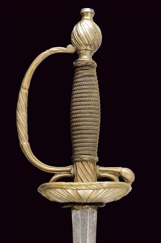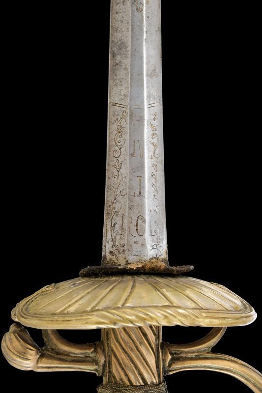 Lama diritta di sezione esagonale, con resti di incisioni dorate a motivi floreali e geometrici nella parte iniziale; al tallone tracce del motto “VIVE LE ROI” su entrambi i lati. Fornimento in ottone, con coccia decorata dal tipico motivo a scanalature oblique, due archetti, braccio dell'elso, ramo di guardia e pomo decorati en suite con la coccia. Impugnatura in legno rivestita con trecciola e teste di moro in filo metallico. Privo di fodero.